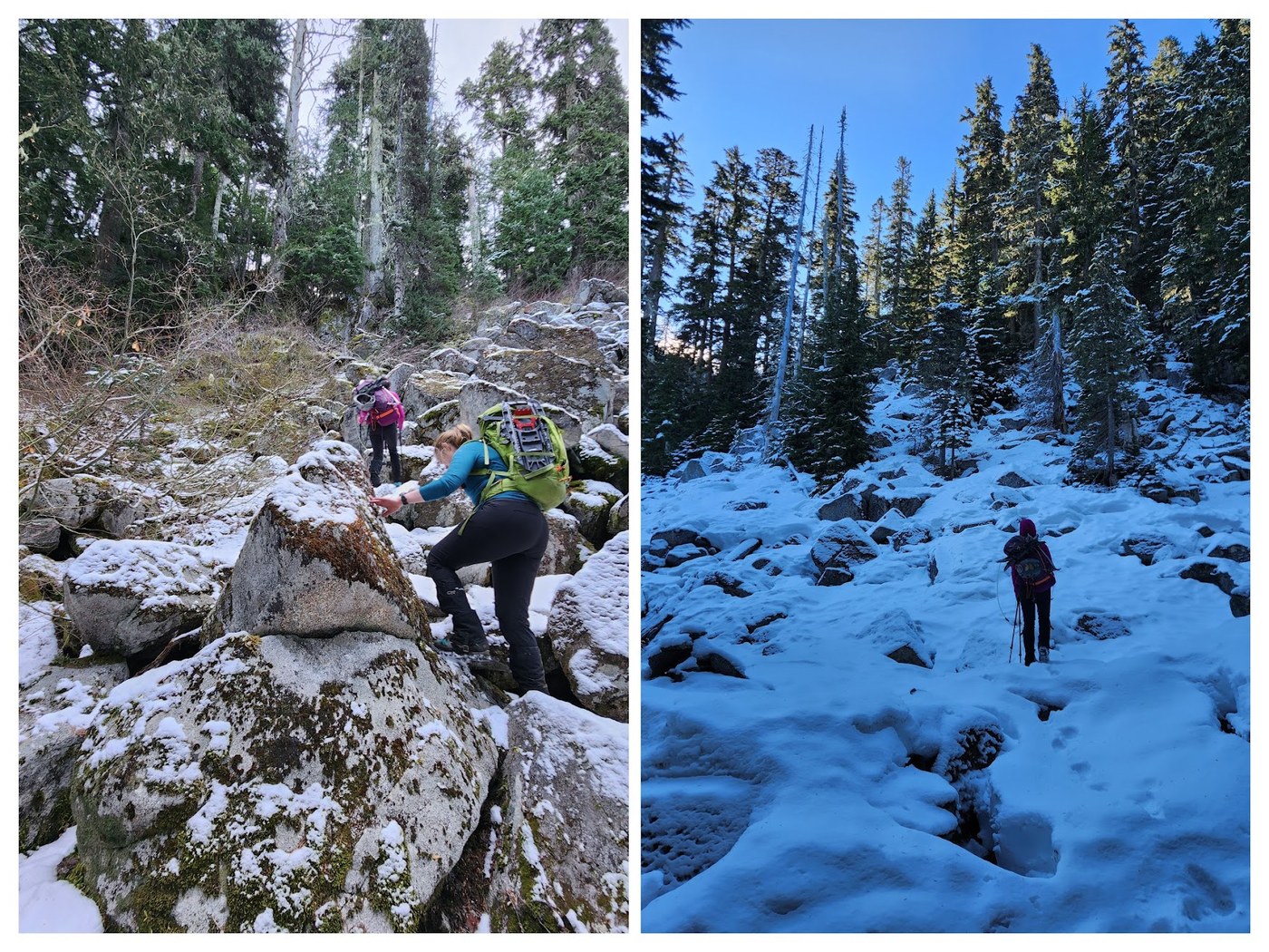 The first boulder field at about 3,700' had just a couple inches of snow and frozen moss on it which made scrambling up it kind of awkward. The second boulder field was much more snow-covered, and we breezed through that one.