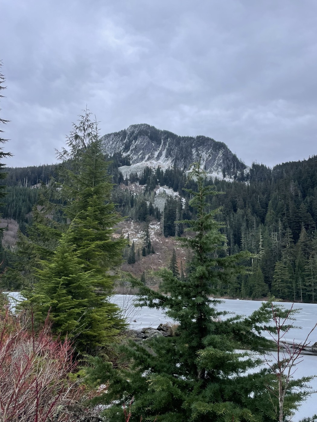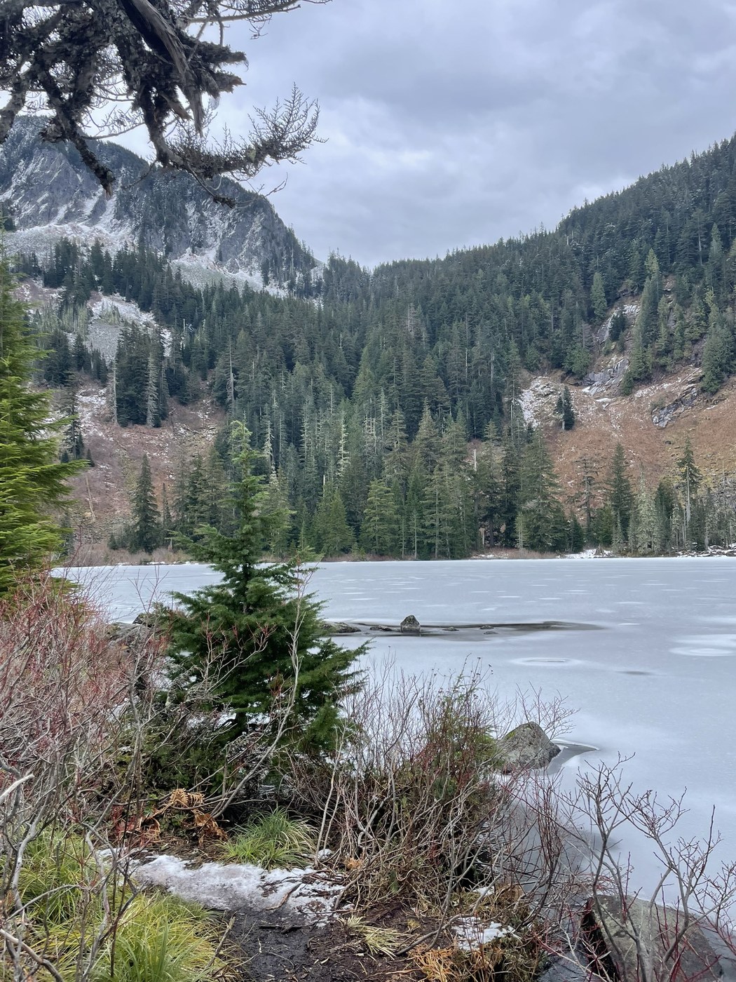 🌲✨PNW magic! ✨🌲 couldn’t ask for a more beautiful cozy day hike. 🥰 I was planning on trying mailbox, but wanted to wait for a day with more visibility and less moisture for rock scrambling, so opted for a trail with a lower elevation, no peaks, and a lake destination. Boy howdy I was not disappointed! This is maybe one of my new favorite hikes. Granite creek was a constant companion. I only visited the first lake I came to, but it was a gorgeous expanse of thin ice surrounded by stately mountains and alpine vibes. I saw a pika or marmot. I don’t know. They were so cute and patient.