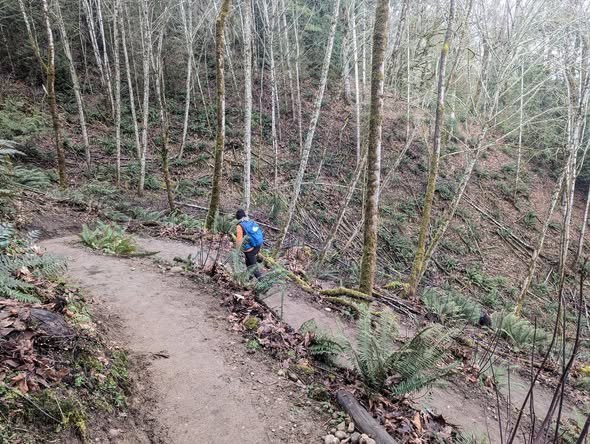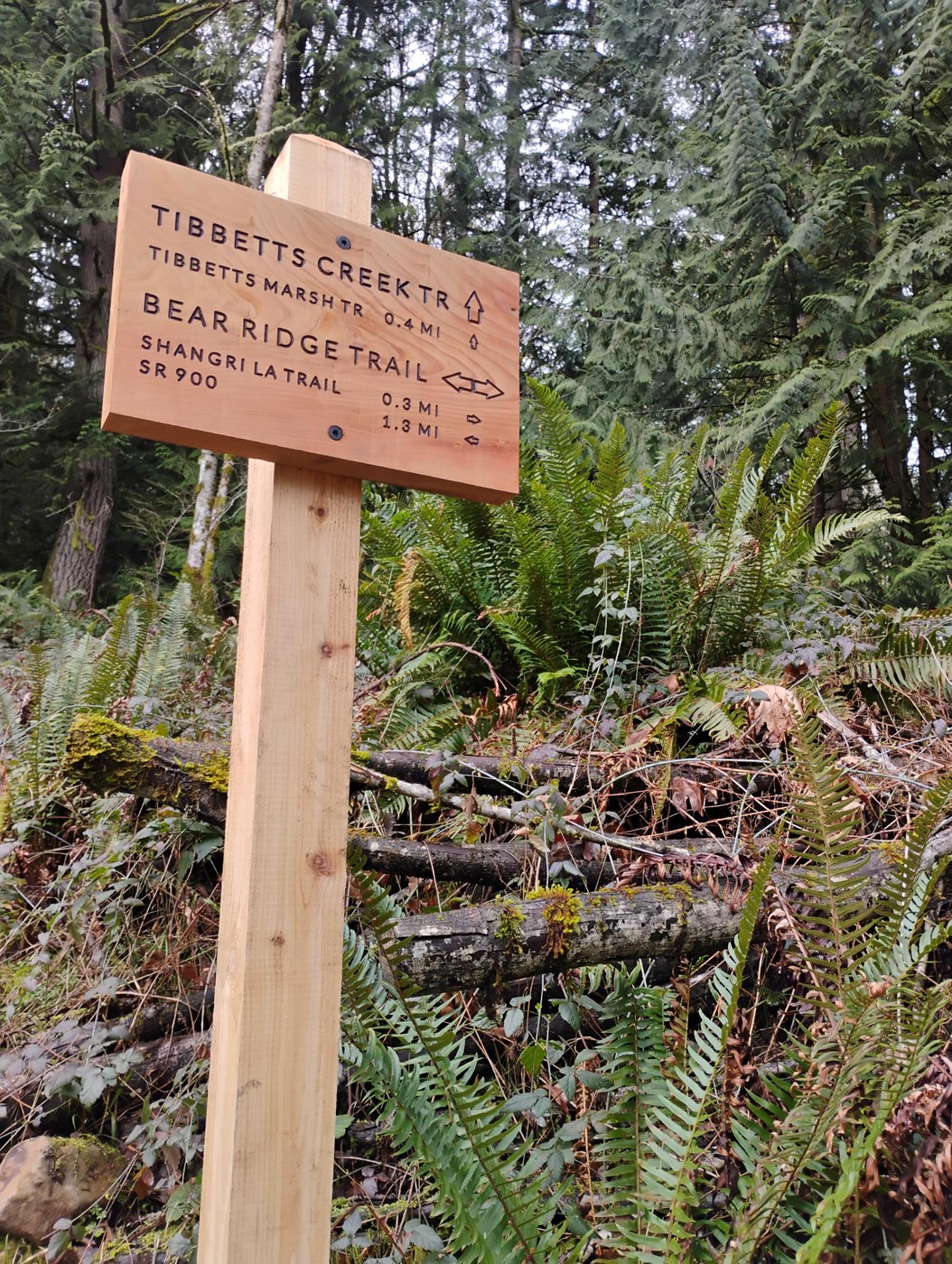 Always interesting to see how many different trails it takes to make a loop at Cougar Mountain. Today, to make our little 5.7 mile loop we walked on 11 different trails. It was actually our first time starting at the new-ish Big Tree Ridge Trailhead, a very nice facility and the trail was in great shape and so nicely built with all the switchbacks up. You lose the highway noise after about 0.8 miles. We were interested in at least a bit of elevation gain, and this loop totaled just under 1300 feet, with nearly all in the first two miles. Thanks to KIng County for such well maintained and signed trails (you still need a map though) at Cougar and many brand new trail signs. Some still had that freshly cut wood smell.