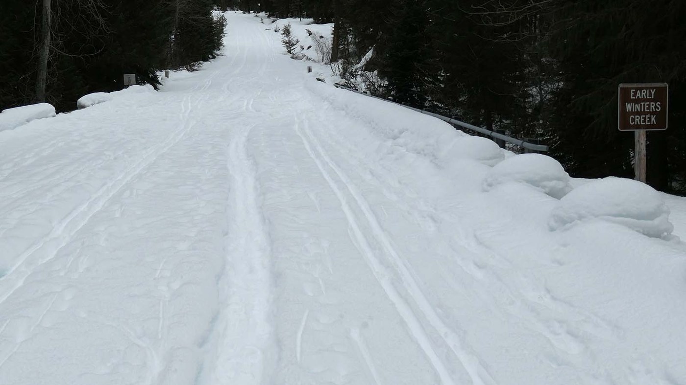 My plan was to snowshoe up Klipchuck Road and then partway up the Driveway Butte Trail. With the temperature below freezing, the snow was firm in the tracks with very little postholing in boots. Out of the tracks, there was about 2" of new snow over a crust that would not support walking in boots. Even so, I didn't need my snowshoes to get to the trailhead. The one downed tree on the road and the other on the trailhead access were easy to get by.