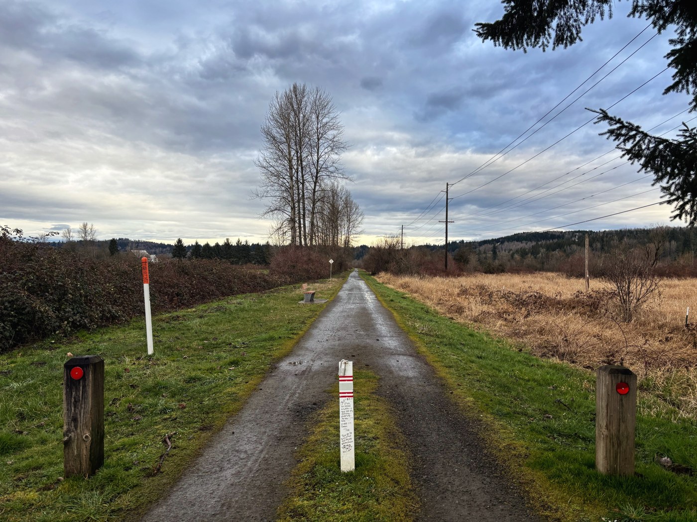 Trail conditions: typical interurban trail – traffic audible and sometimes visible. Wide, flat, and straight, with dirt/gravel so packed that it almost feels paved. Even with puddles, it wasn’t mushy or slippery. Overall in great condition, though there was rather frequent poop on the trail. Installing reminder signs and doggie bag dispensers next to the frequent benches might be helpful for that; I didn’t see any along the way. The path follows the powerlines, which gets a bit in the way of your ability to take pretty landscape pictures, but it’s still a pretty landscape behind the power lines.