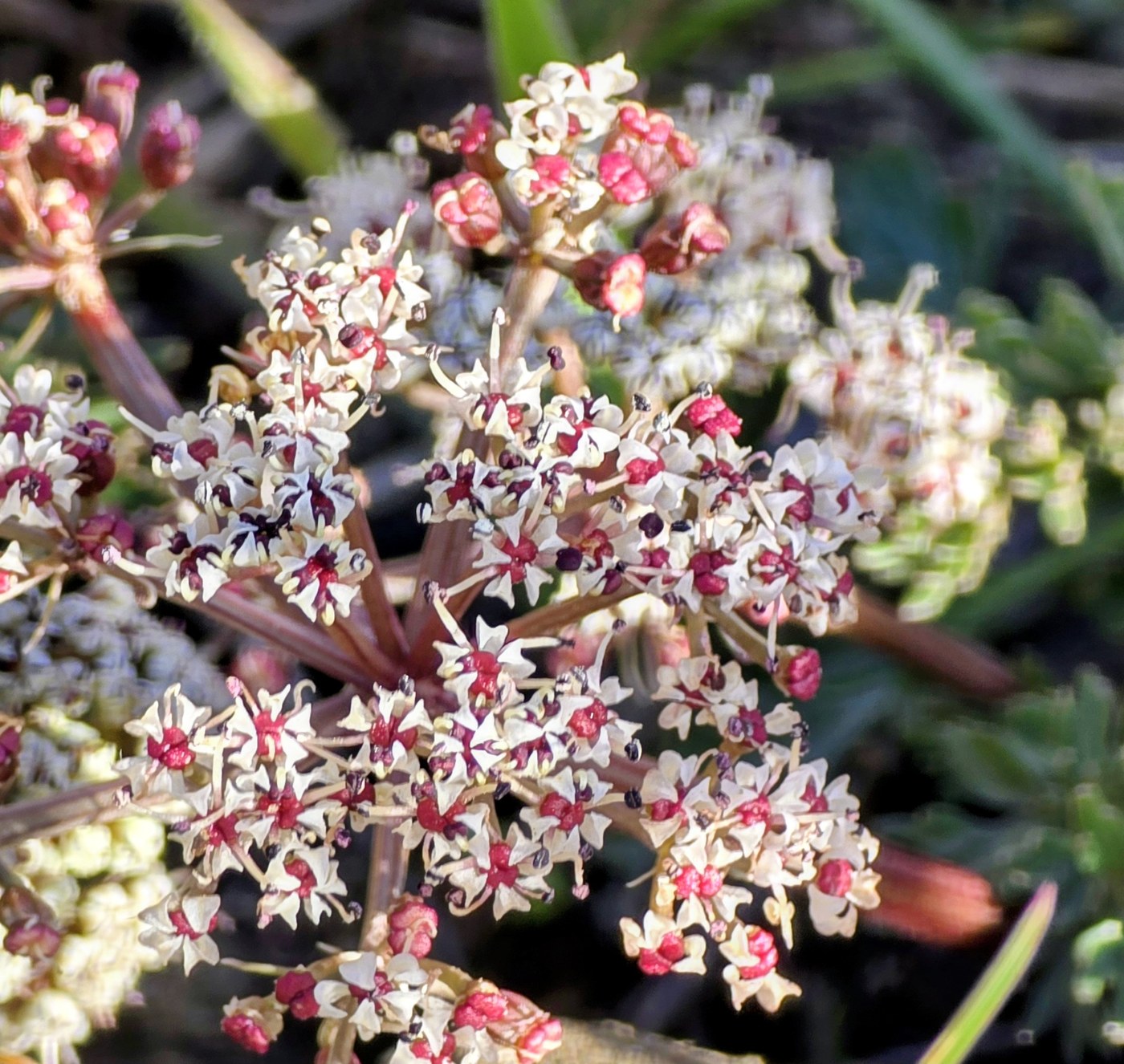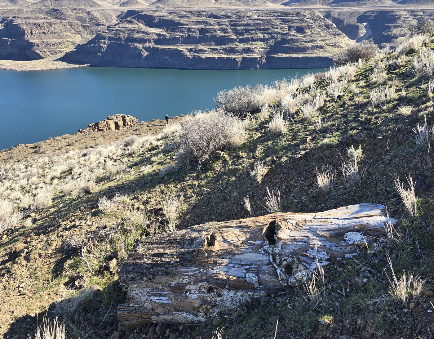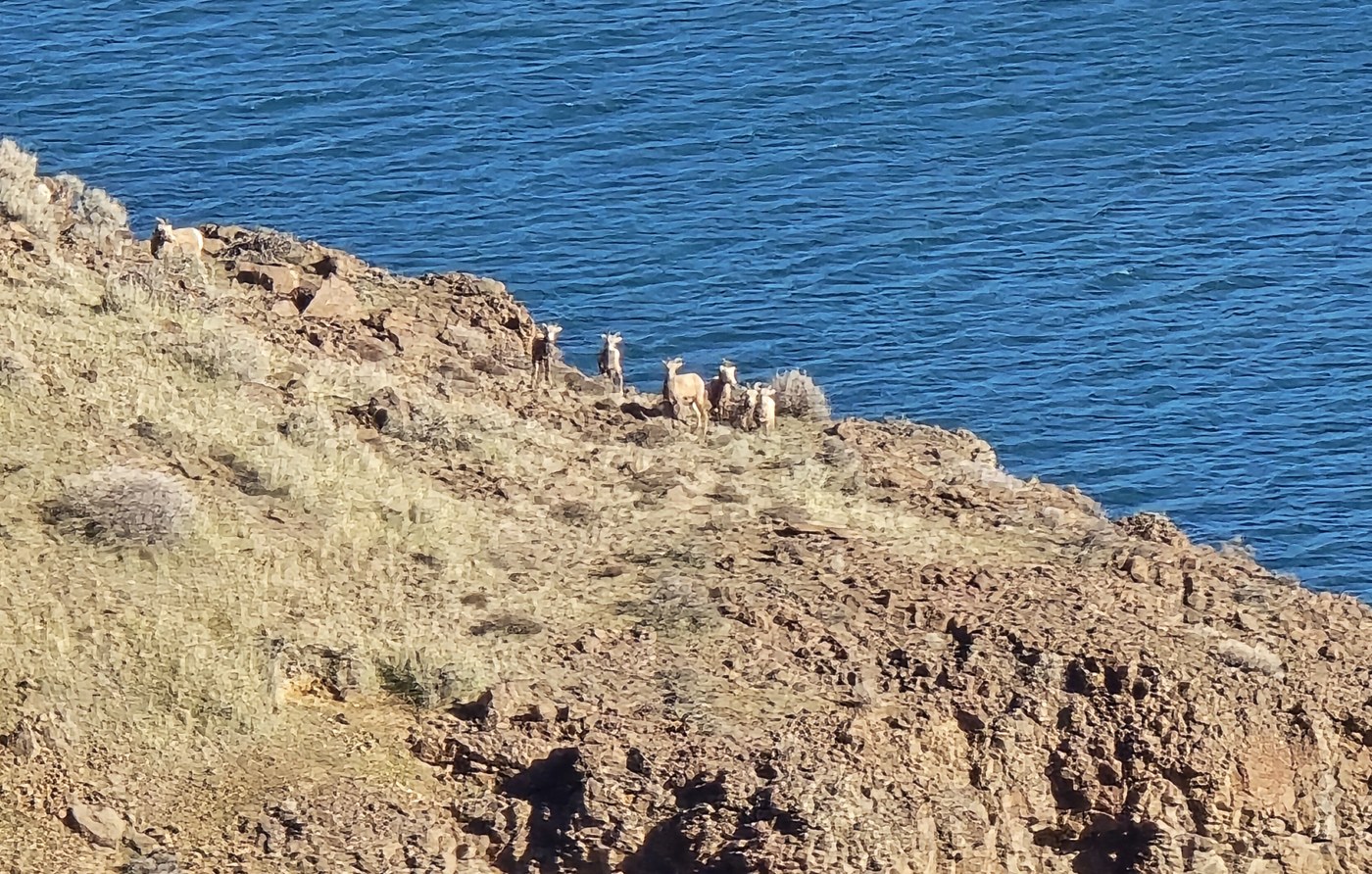 Speedwell and I hiked along the Bluff trail and then out to an area that is thick with petrified wood (caltopo attached). An old 2-track leads to this area. At the end of the 2-track there are USGS markers embedded with wood. If you drop down 40 feet of elevation to the north, you'll find a large, half-buried petrified log (photo 2). We saw 2 groups of bighorn sheep (photo 3). I saw a yellow-bellied marmot at the trailhead and Speedwell saw a coyote along the bluff. The only native flower we saw was desert parsley (Canby's I think, photo 1, there was lots of it). We also saw Whitlow grass and red-stem stork’s-bill. The bathroom at the trailhead was very clean with plenty of TP and hand sanitizer. This is my favorite winter trail, often sunny, sweeping views, great wildlife, and great tread along the bluff portion. There was no mud. It was a lot of fun to see the ravens playing and socializing, video attached. They reminded of the line from Lucinda Williams' song 'Blue',