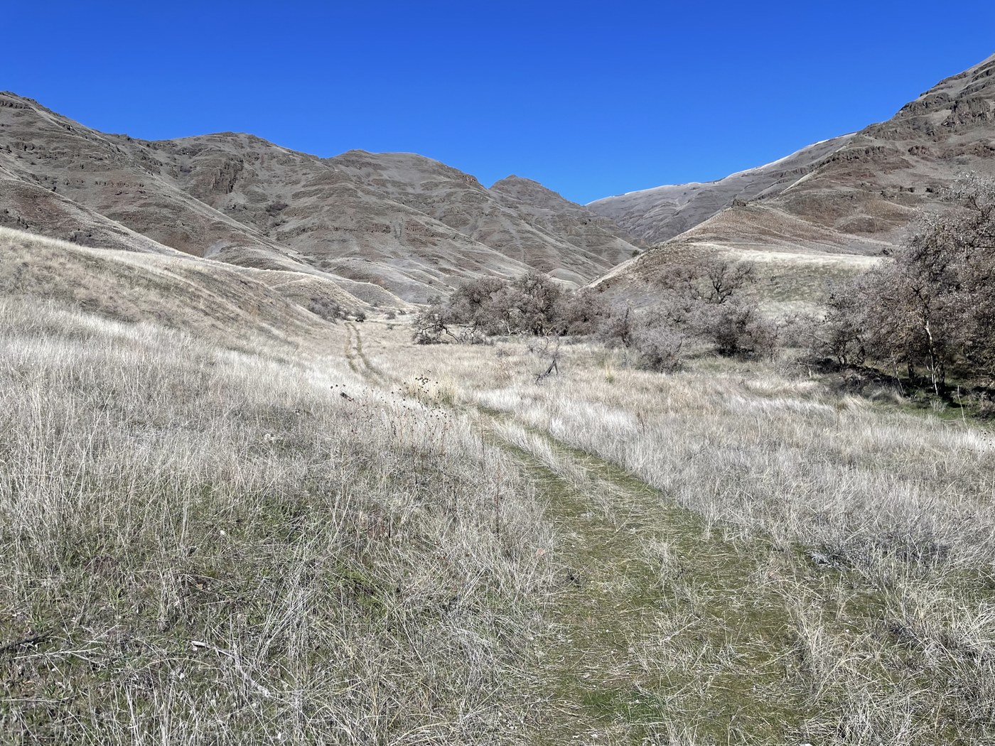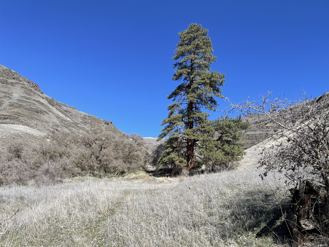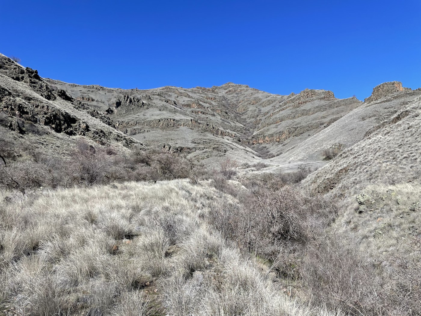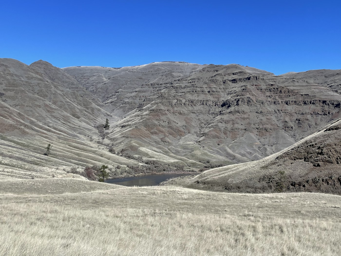 This is one of several units of The Chief Joseph Wildlife Area located near The Grande Ronde River in Asotin County. One can walk for several miles along the river on an old road or ascend old roads up Myers Creek and Hackberry Gulch for big views of the surroundings. There is a parking area as well as a pit toilet nearby. Shumaker Grade drops 7.1 miles and 2600' vertical down to the river from Montgomery Ridge Rd near Anatone. The transition from top to bottom is almost like a change in seasons.