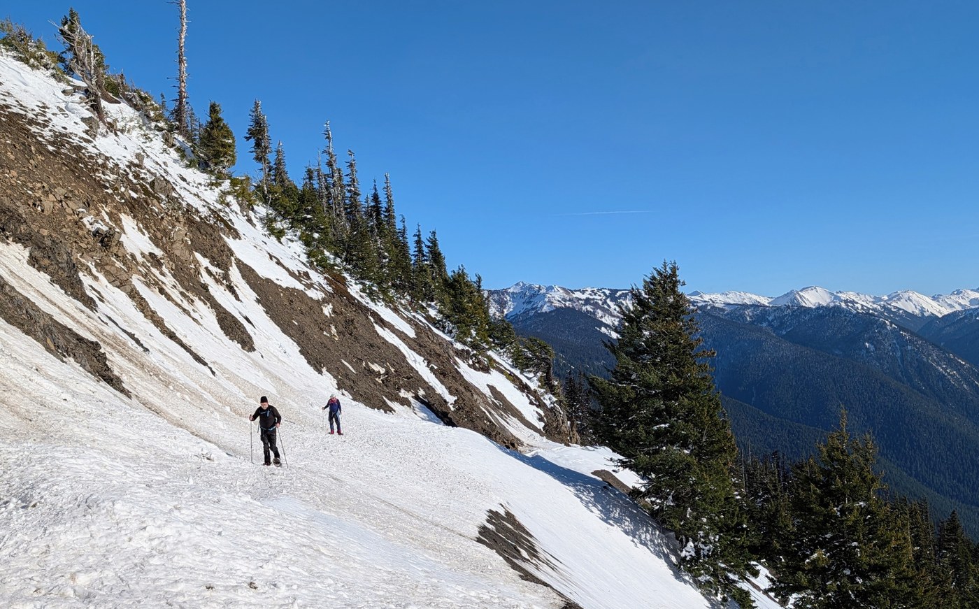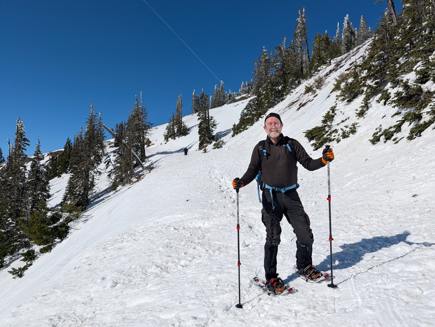 The Park Service is no longer asking snowshoers to register before heading out. We parked by the start of Obstruction Point Rd and set out from there. We opted not to use the alternate access route described by WTA above, because this has not been a heavy snow year, and the road cut wasn't filled in with snow.