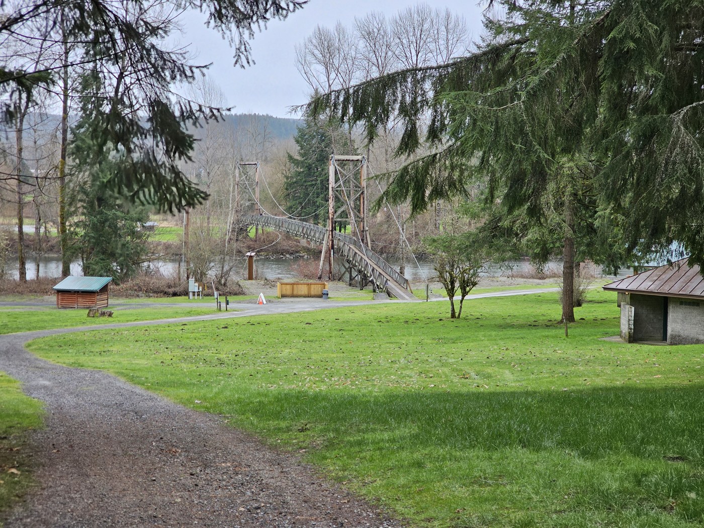We headed down Quail Trail, which was most of our elevation change. We dropped down and passed the yurts and cabins and headed to the bridge. The bridge had a deck of interspersed slats that allowed you to see the water below and the side rails had metal mesh affording an even more open view. We could feel the bridge sway as we walked across. It was subtle, not like a rope bridge, but just enough to have to verbally confirm it was actually moving. There's a viewfinder on the bridge looking south with an image imposed of the old bridge just ahead of the current Tolt Hill Road bridge. It explains how it was the last of its kind in the US.