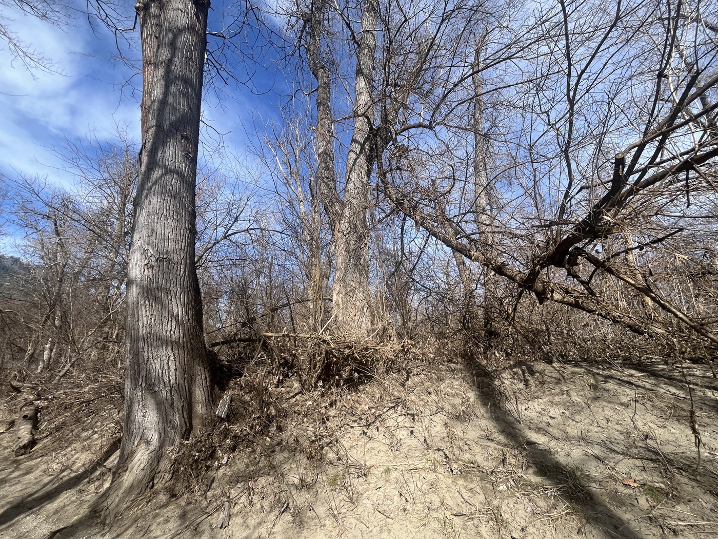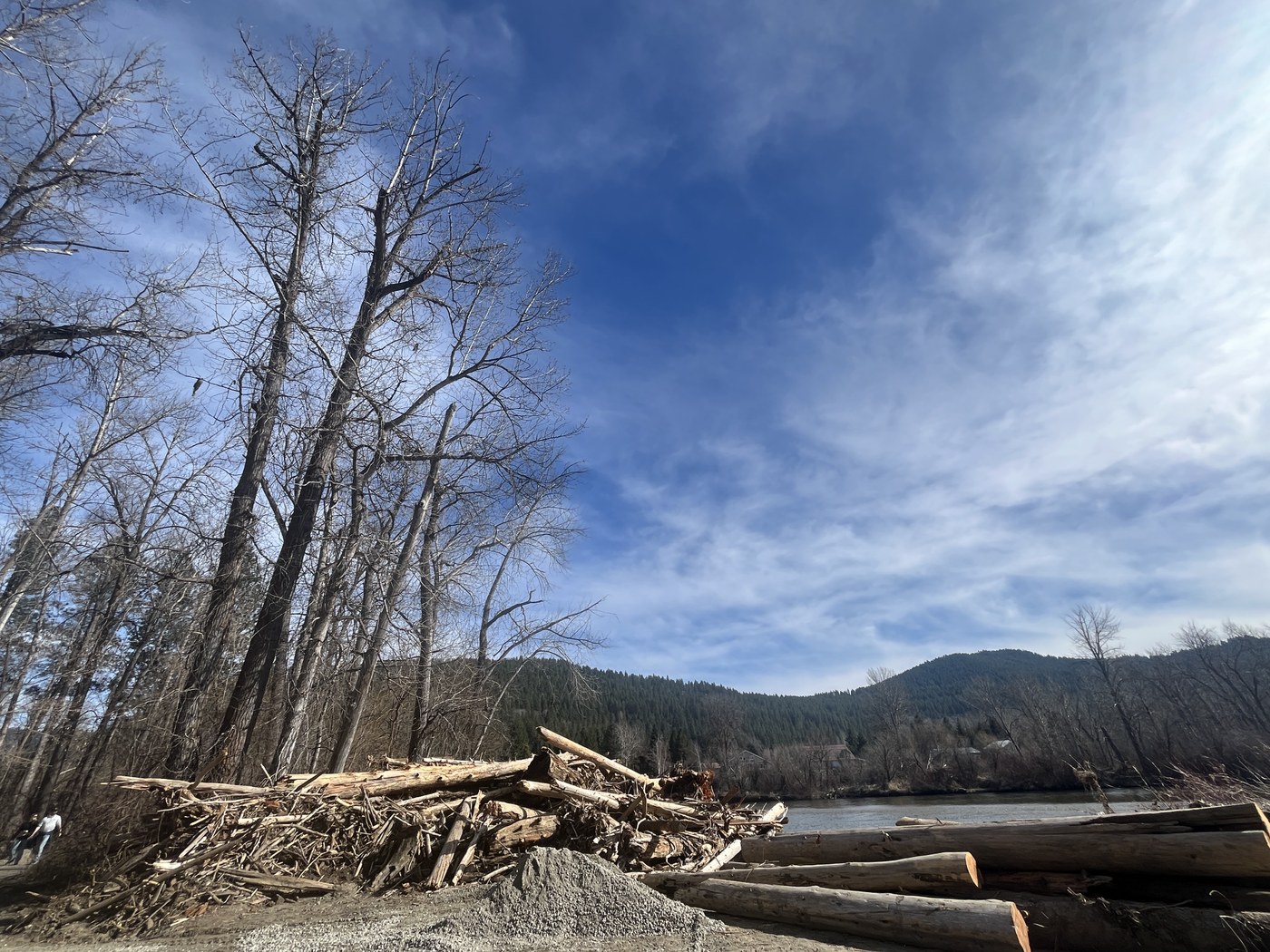 I parked at Enchantment park and walked to Wenatchee River Institute and back. The flooding from December with obvious, similar to Al Borlin Park in Monroe along the Skykomish when it has its seasonal flooding. Vegetation covered with river silt and log debris piled up against trees, still standing.
