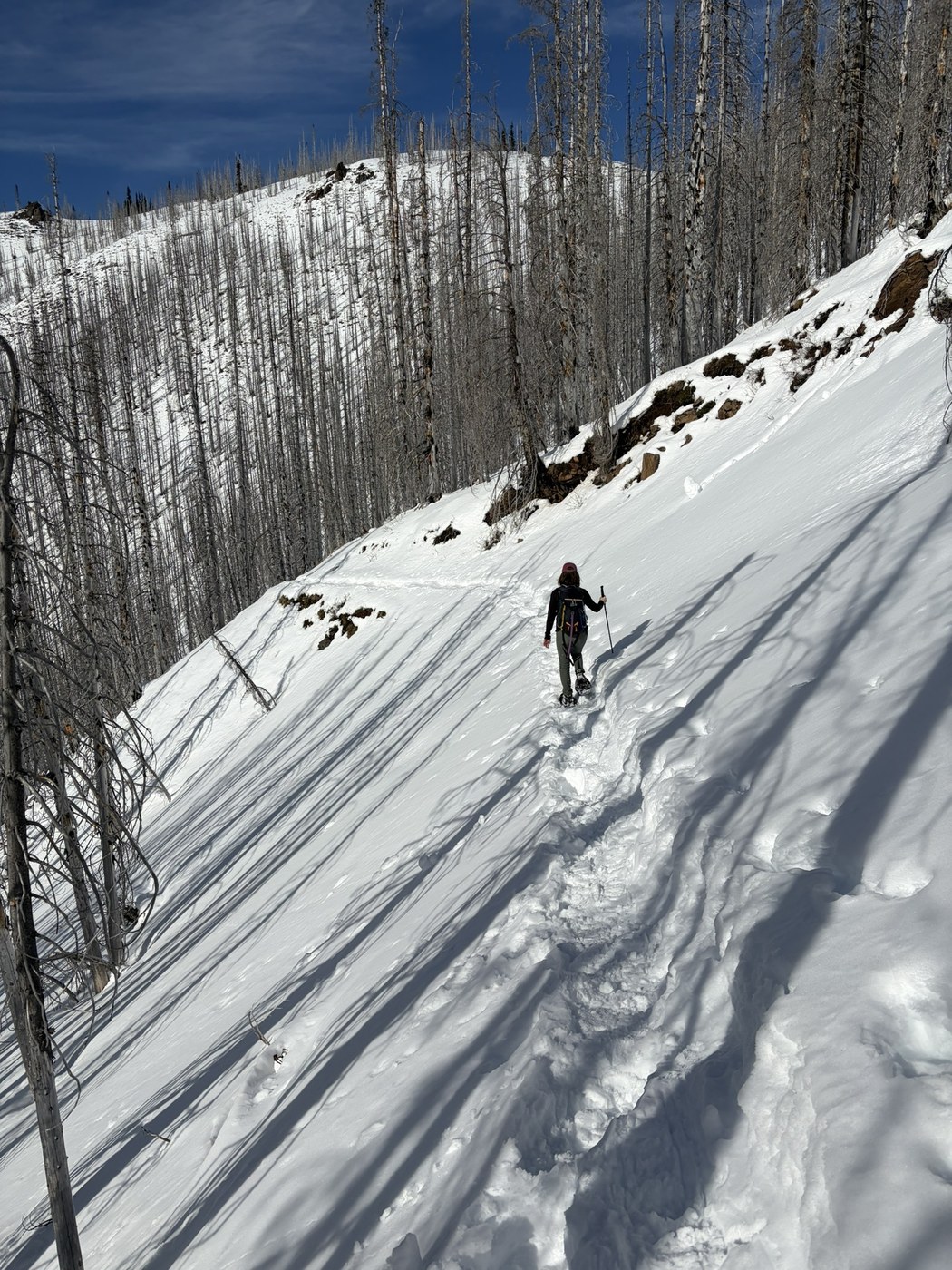 Had the trail to ourselves today. Saw not another soul on a warm sunny Sunday. Trail is easy to navigate, snowshoes recommended once out of the trees and into the burn area. We didn’t got all the way to official Norse Peak but to the first high point at about 6700’. Rainier is huge and looming, Adams and Stuart in view too. Gaia clocked 7.5 miles 2700’.