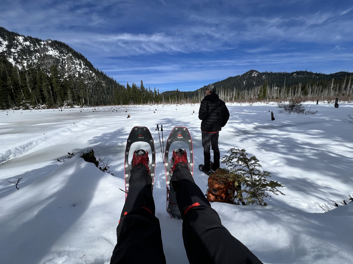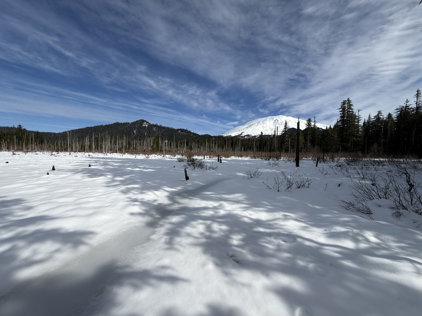 The marsh lakes were frozen and snow-covered in about 1.5 feet of snow with critter tracks snaking across in multiple directions. We stopped, had a snack and enjoyed the total silence of the place while admiring Loowit's snowy SW flanks.