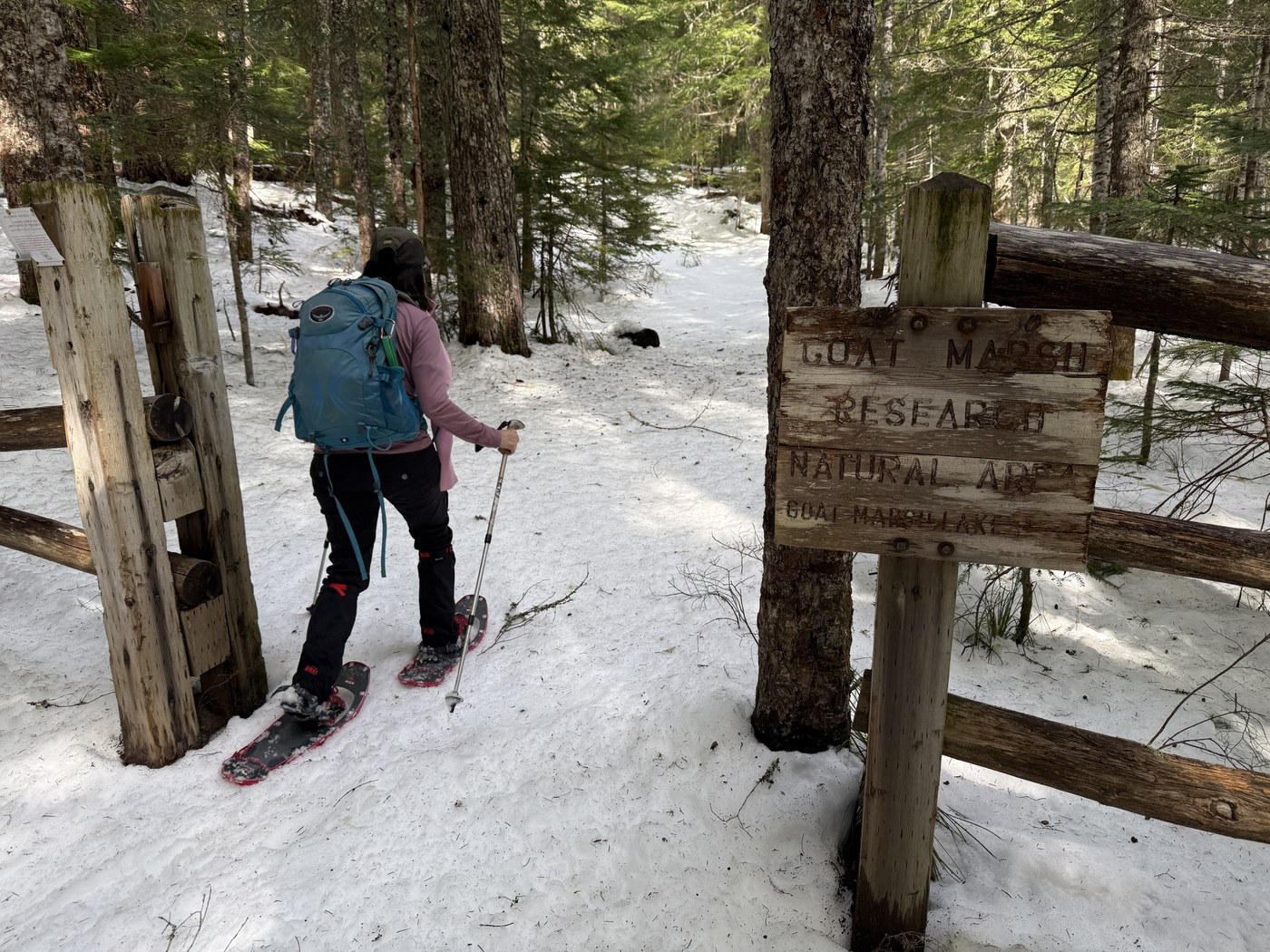 From here we walked on road 81 about 1 mile to where the Kalama Ski Trail crosses road 81 and turned northward toward Goat Marsh. The snow was fully covering the trail with about 1 to 1.5 feet of snow so we put on our snowshoes and cruised our way to the marsh.