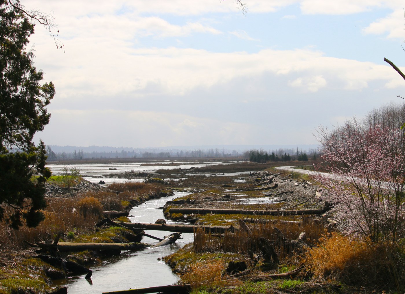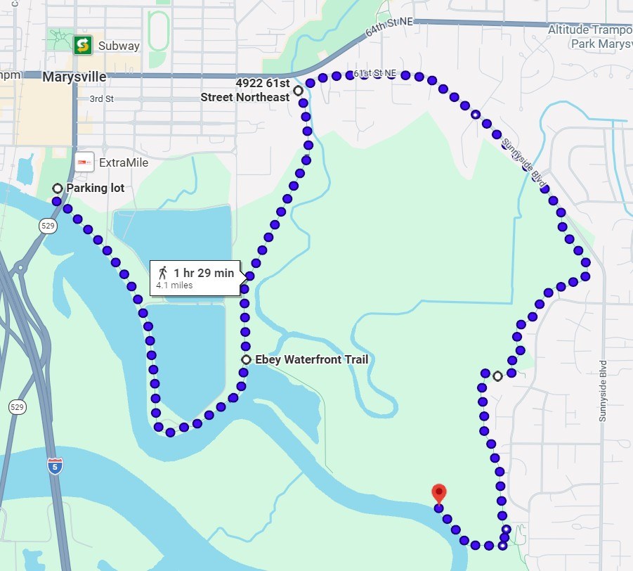 From this new trailhead we walked east along 61st St NE about 350 yards to where the eastern portion of the trail starts, initially as a newly surfaced very wide sidewalk, then splits off closer to the estuary running between housing developments and the water and finally turning back west ending where the levee has been breached to make the estuary. Additional access to this eastern section can be made at two small City of Marysville parks - Harborview Park and Olympic View Park, each offer a little bit of parking and access to the trail. Total out and back mileage for the full route ended up at about 8.2 miles with virtually no gross vertical.