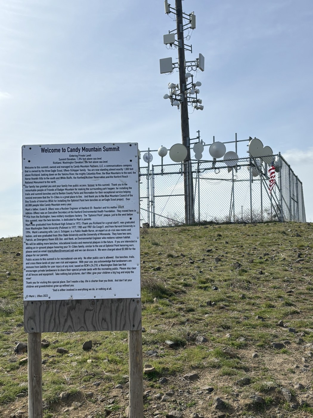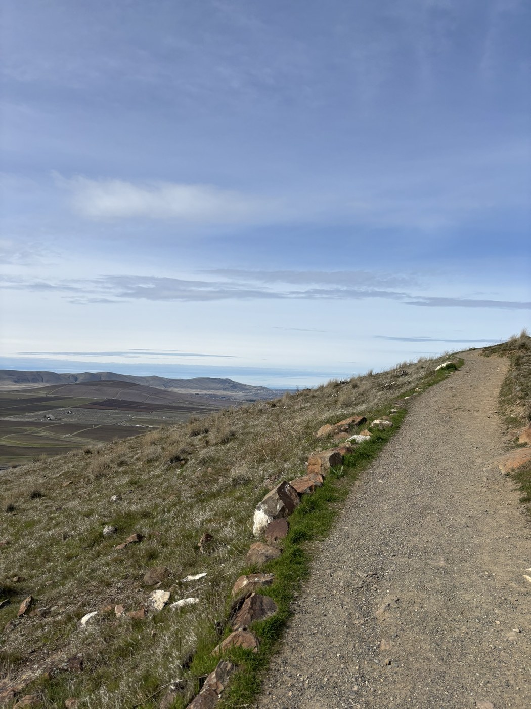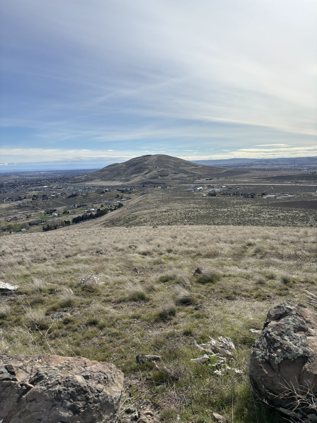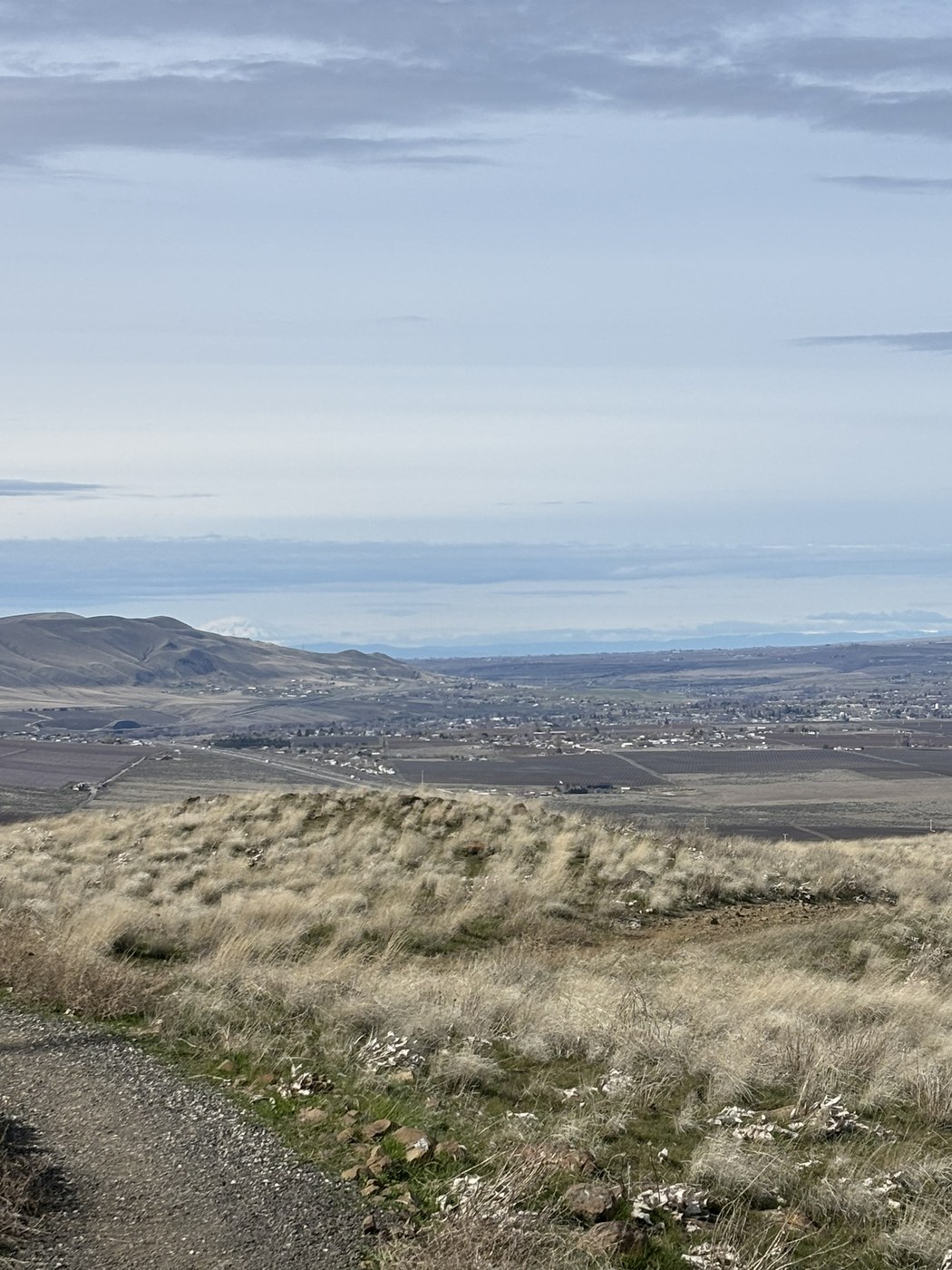 We had a few hours to spend before heading to the NWAC basketball championships so we decided to find a local hike and this one was perfect. The trail is wide and well done, very easy to follow. It’s a very gradual ascent up to the summit. The parking lot had quite a few cars in it but the trail never felt crowded. There’s a clean porta potty in the parking lot. There are no wildflowers yet but it looks like this could be a pretty trail in wildflower season. Lots of out of season balsamroot plants. The views at the top are of the surrounding communities and very pretty. We also got views of Mt. Adams through the occasional clouds. All in all we really enjoyed our hike.