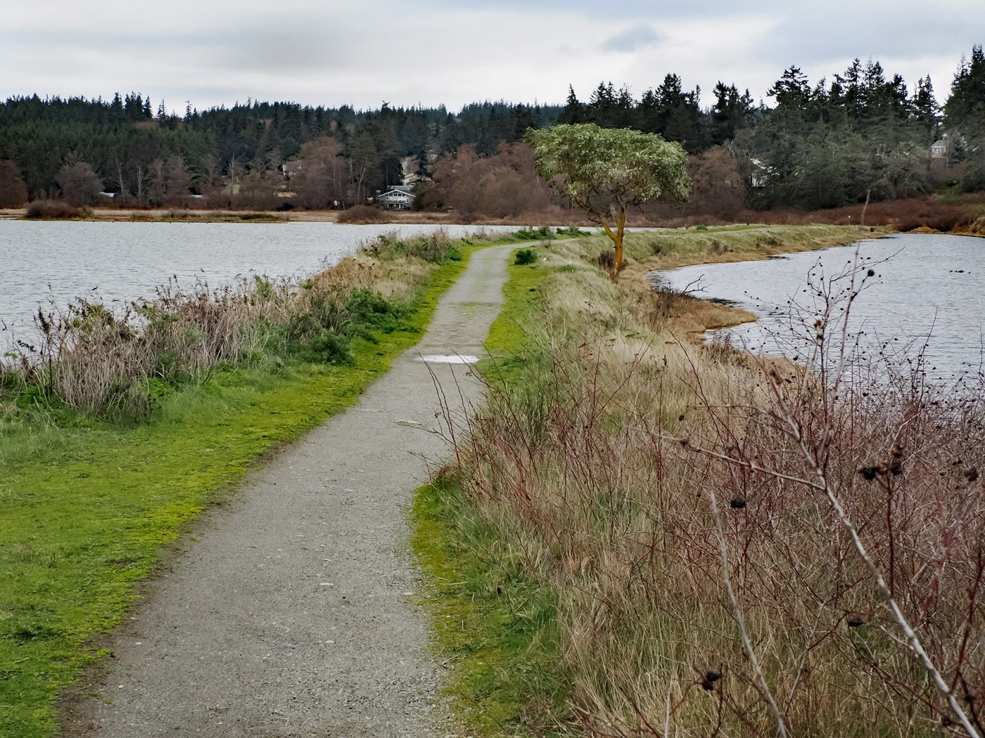 I began at the end of Deer Lagoon Road in a residential area where the trail is thick with blackberry bushes on either side. The trail emerges into an open area and splits going along the tops of two dikes heading southwest or going east and then south. When you can't see the whole area, it appears to broken up by separate bodies of water but it all part one lagoon. The trail is not a loop as it ends at two separate spits. If you do the whole walk with retracing your steps the distance is about 3.3 miles.