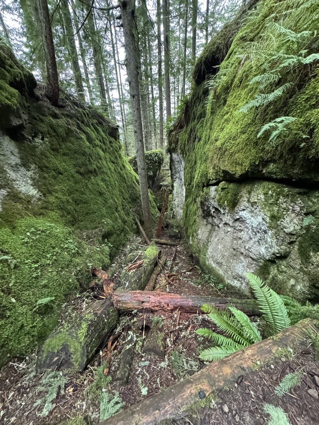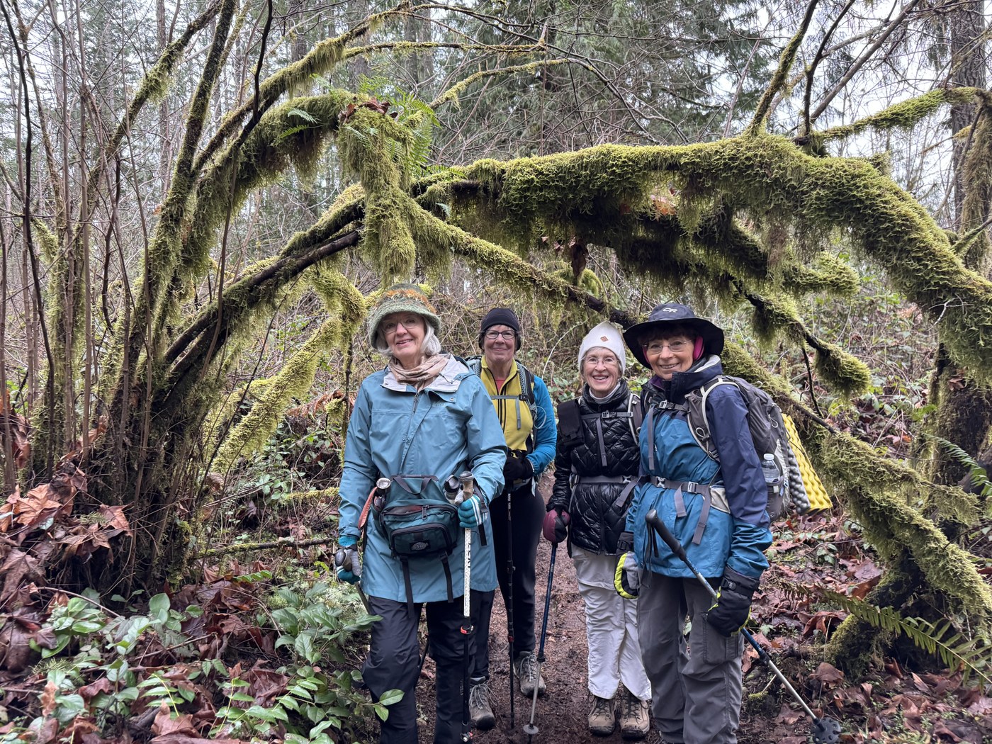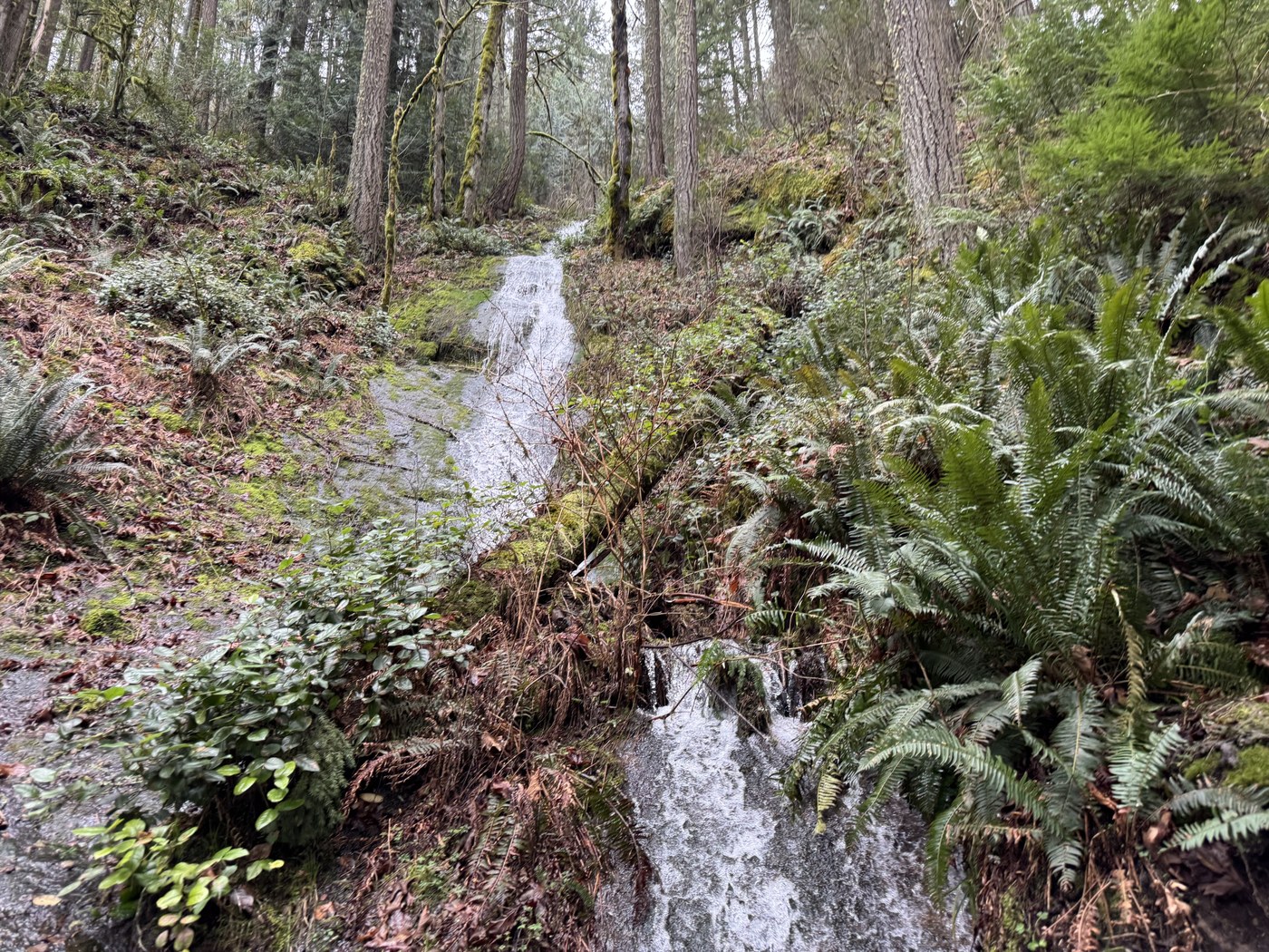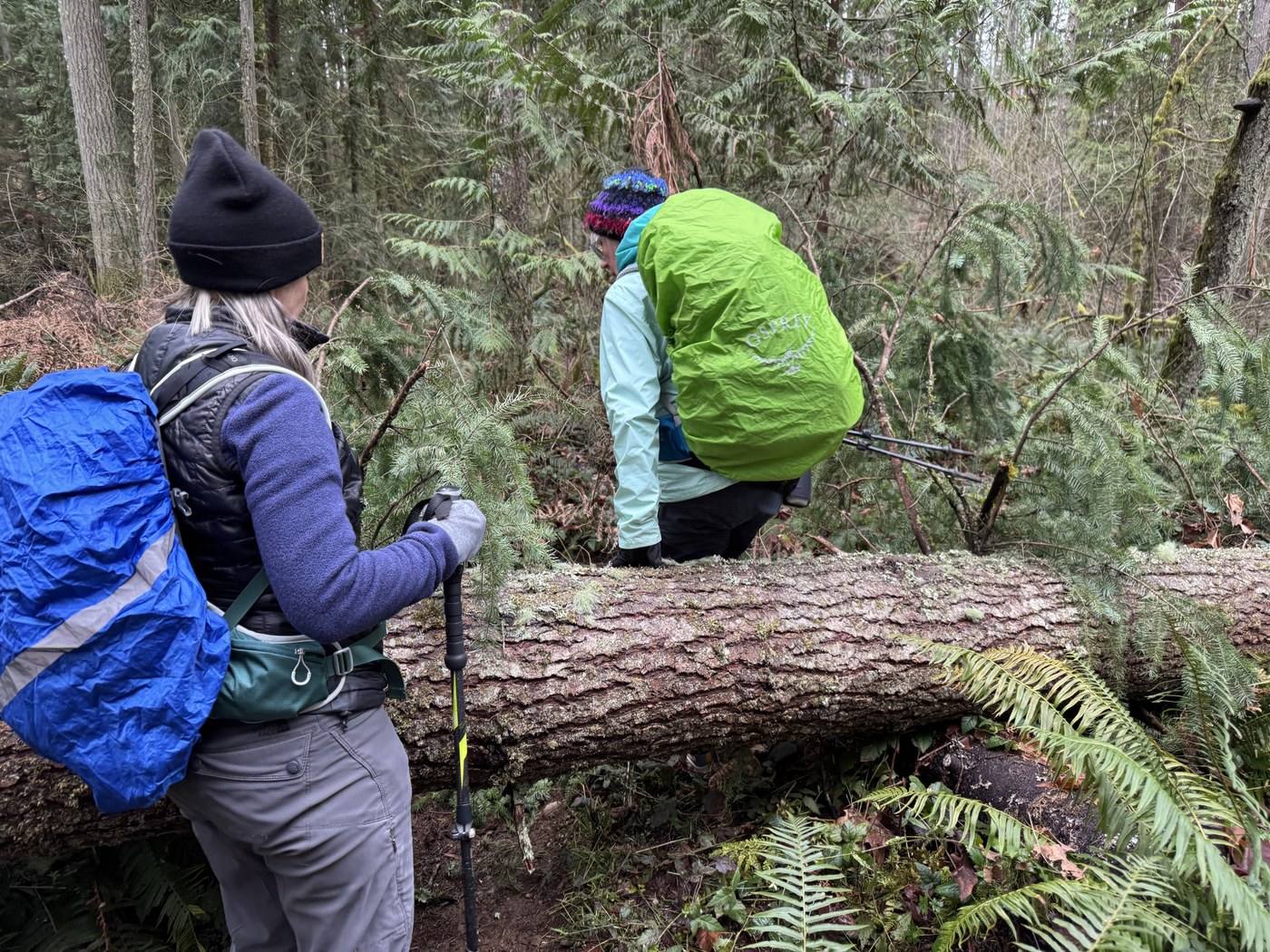 My hiking group hiked Talus Rocks today. We met at the East Sunset Way Th at 9:00. Two cars were in the lot when we pulled in. It was overcast skies and 42 degrees. This trailhead has no toilet so plan to green door. There were loads of branches and evergreen fronds in the lot which was a precursor of the whole day. Our 5.8 mile lollipop loop hike followed: Tradition Plateau, Wetlands, Advenuture, High School, Section Line, Talus Rocks, Nook and Bus Trails around Round Lake and back to Tradition Plateau trail. The entire trail was hard packed saturated soil. After the huge windstorm yesterday downed trees and the deadfall debris was everywhere. Adventure trail had a large fir you had to climb over. Nook had 6+ deadfall’s over the trail. We were constantly tossing off evergreen fronds and smaller branches everywhere we walked. We turned back on the Talus Rocks trail at the huge rock face. It had a beautiful legit waterfall cascading down. The branches and logs at the base of the rocks have been displaced and crossing would mean taking 2 steps on slippery logs. I tried it and it was doable with Poles but out of a comfort zone for a few hikers in my group. Trail traffic was super light we saw 6 other trail users the entire time we were out. We saw robins, wrens, juncos, a chipmunk and 2 deer, that’s it for wildlife. Rain held off for the most part, when we stopped at the Round Lake benches for a snack break. When we drove off at 1:25 only 2 cars were in the Th lot. another fantastic day out in nature with friends.