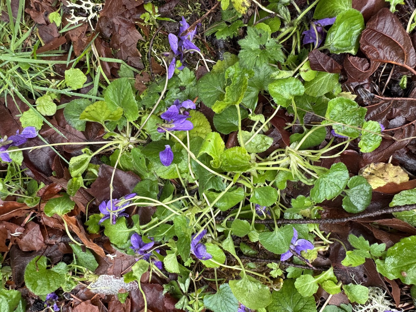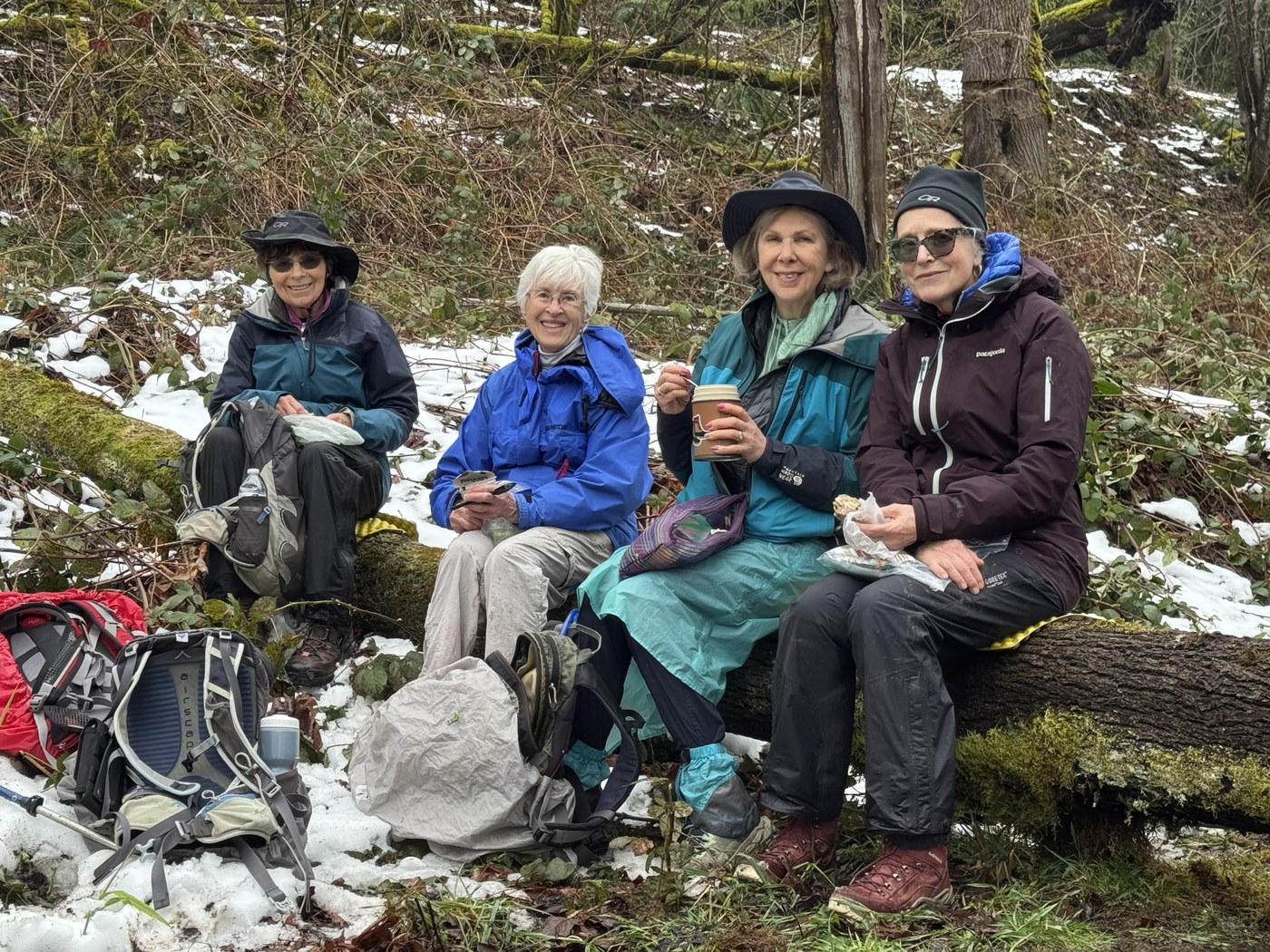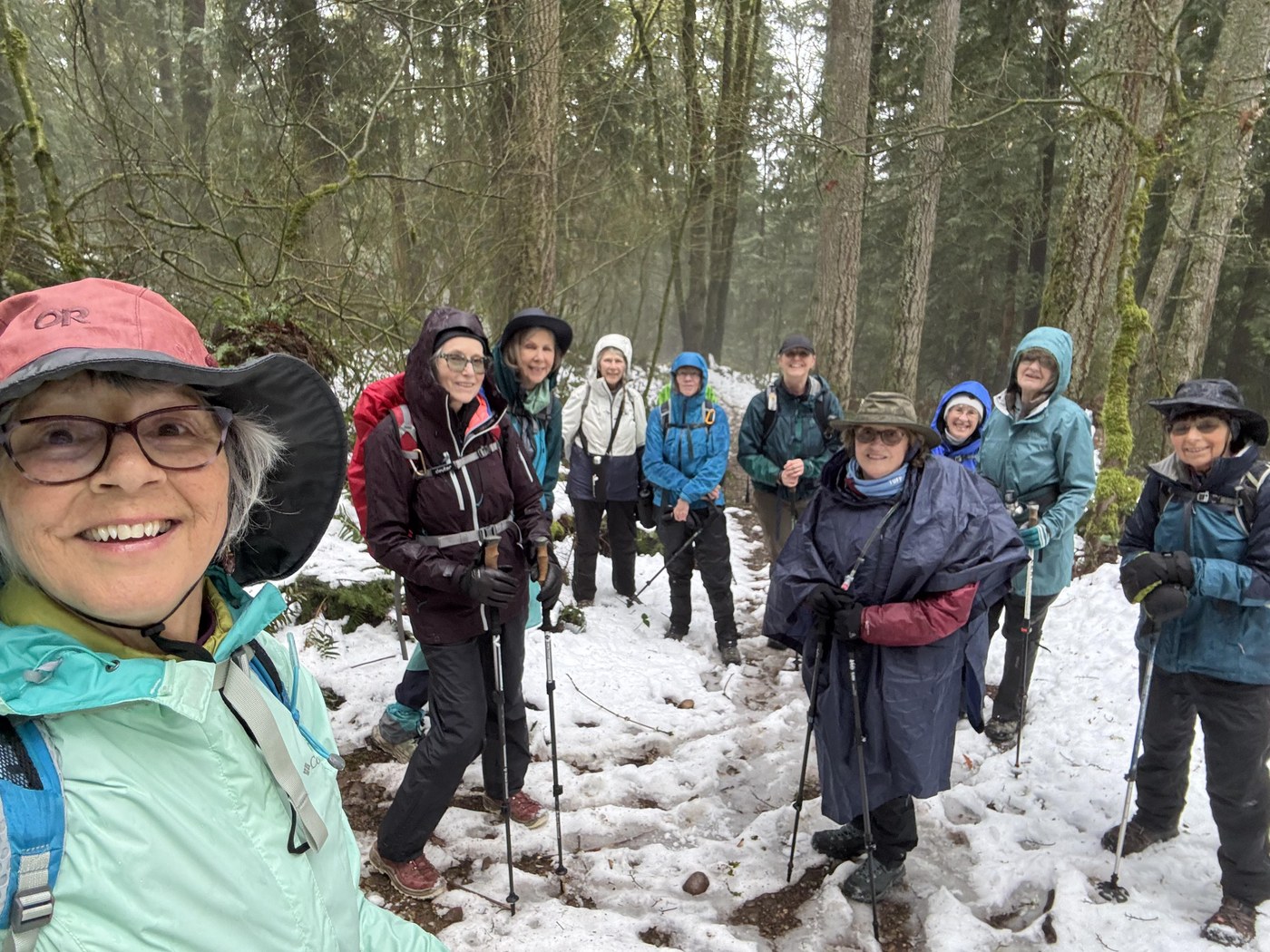 My hiking group switched gears to hike a lowland hike with the snowfall over the weekend to Echo Mountain area at the Spring Lake Th. We meet at the Th at 9:15, it was 43 degrees with significant rain falling. There was a was a vault toilet available down at the Spring Lake boat launch, a short walk away. Weather forecasts indicated the clouds would break up by 10:00 and that’s exactly what happened. I’ve hiked to Echo Mtn several times to see spring wildflowers in late March / early April. Today we were surprised that several inches of snow was still on the ground for about half our route. Wanting a longer hike we explored the MacGarvey Open Space under the power lines and back into the forest. Our 6.7 mile route followed Trillium Way, R on Ridge Loop (look for the Tree Stump Guy), R on Echo Quarry, R on an unnamed path to Wetland 14 natural Area, L on PowerLine then back onto McGarvey East for a big Lollipop loop back to Echo Quarry Trail. To finish our hike we took the Three Lakes South Loop. We decided not to hike to the top of Echo peak with the low clouds hanging around as we knew the view would be nonexistent. With the recent wind and snow storms all our routes were littered with downed trees, deadfall and shrubs covering the trail. We cleaned the trail as much as we could the entire time we were hiking. On the Powerline trail we encountered several long stretches that were flooded. We picked our way around those as best we could. Spring was in the air despite remaining snow on the ground. We saw Osoberry, purple violets, self heal, flowering plum and a rhododendron in bloom. We saw and heard lots of bird species - wren, robins, juncos, geese, mallard, bufflehead and mergansers floating on one of the ponds. We made use of downed Maple Tree on the power line trail and used that as a sitting spot for a lunch break. Beware if it’s raining, that the ditch on the north side of the road adjacent to the parking looks full with over flowing water, it can eat your car! One member of our group backed out and their front driver’s side wheel nosed dived into the ditch with the back of the car several feet up in the air. Thanks to Glen, a local Spring Lake resident for pulling the car out of the ditch with tow chains and his pickup truck. 😊 He asked that 6 in our group hop in the back of his truck as blast weight and it worked! Luckily the car was drivable. The event added to the adventure of the day.