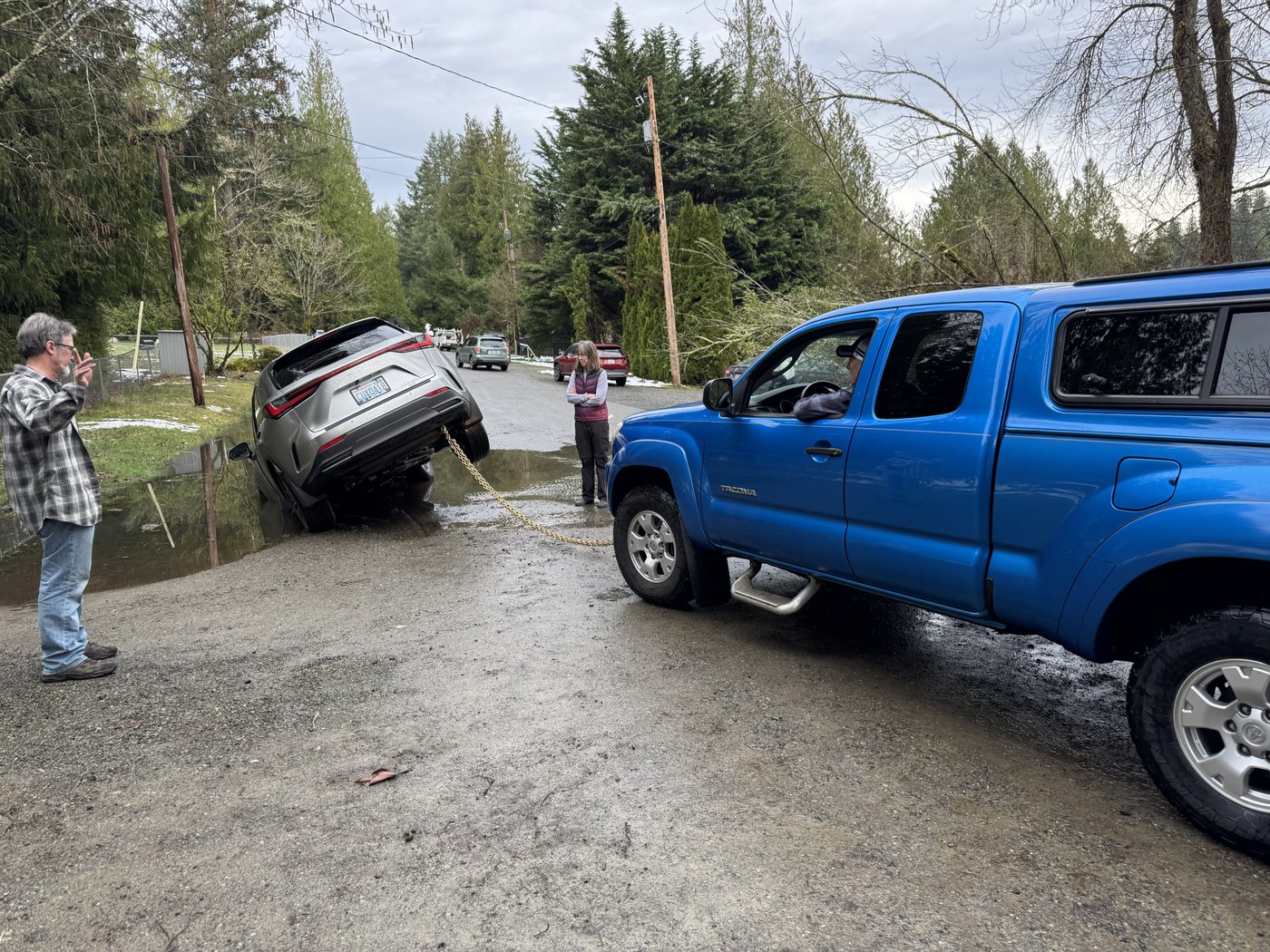 That is so funny. I was there on Sunday and there was a group of four young people whose car was in exactly that same position. Unfortunately I didn't have a tow strap to help them out. They were waiting for AAA. I now have a tow strap in my car 😁