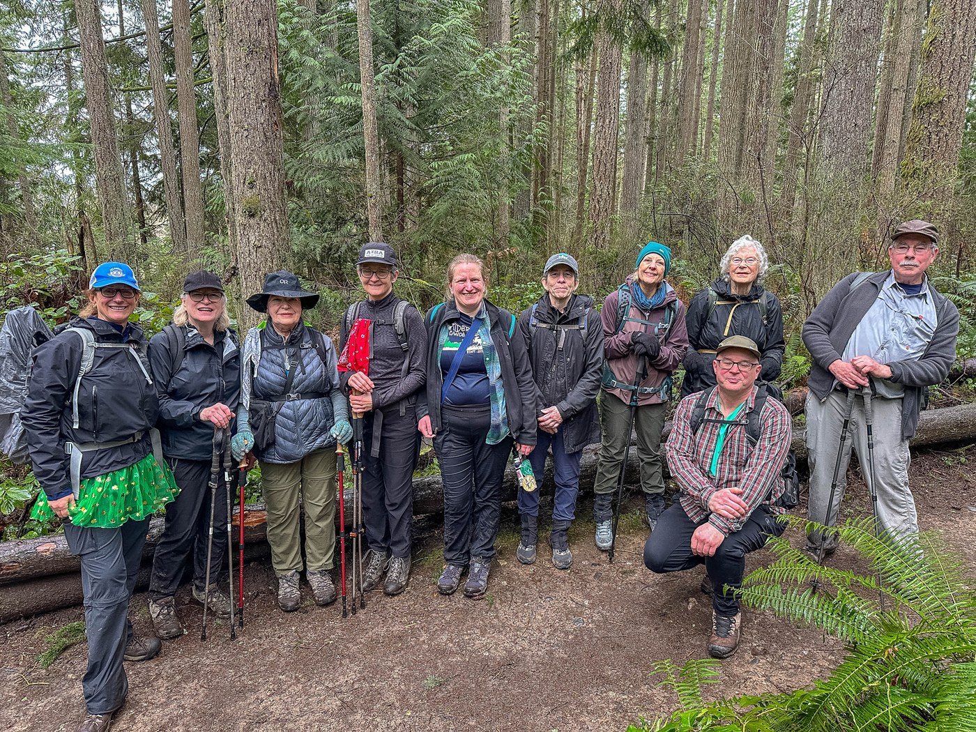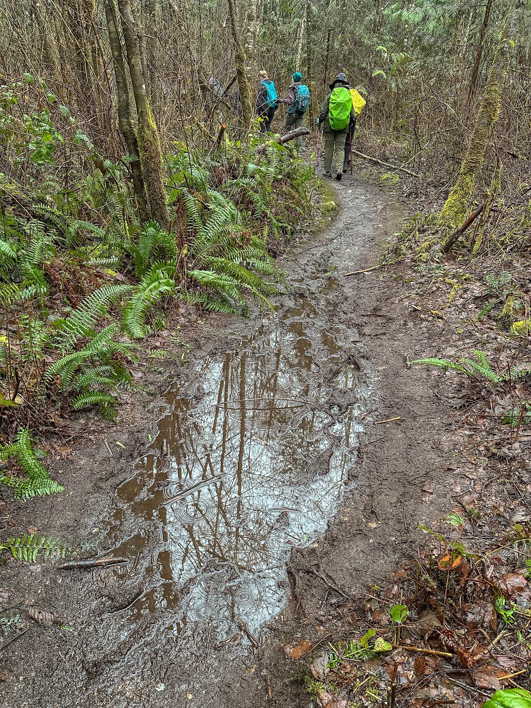 The parking lot is very rutted - surprisingly so - but the portapotty was stocked and everyone arrived promptly so we could start walking at 7:30. Only a few cars remained at 11 when we left. Lovely group of enthusiastic folks, and lots of moss and mud, but everyone came back happy. This was a mentored hike for a new leader who did a great job keeping everyone together on a multi-track trail.