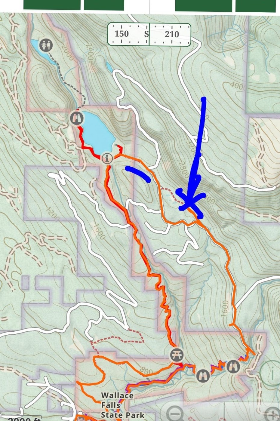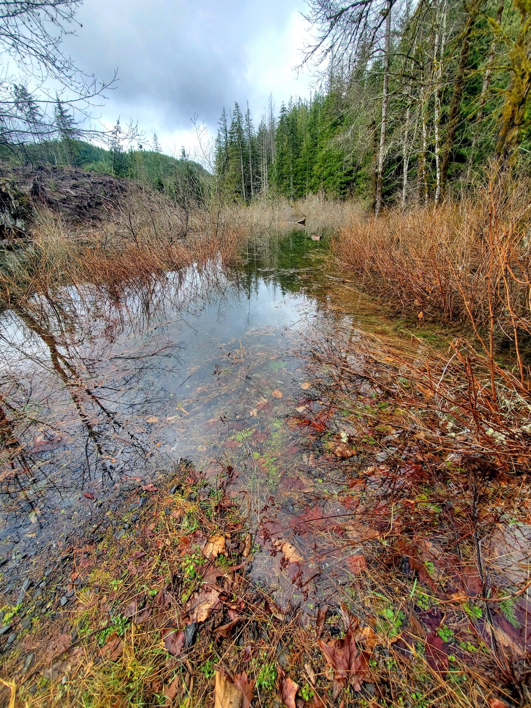 This falls to lake Loop hike offers lots of scenery, adventure, and views! Hiked counter-clockwise. WARNING: trail flooded and impassable along the DNR road about 4.5 miles from trailhead. It's actually a bit of trail leading from the DNR road to go around the last logging op. Looking at my Gaia map I see a marshy area (also on All Trails) and it's very pond like now. See blue line/X in Picture 1 and visual in #2. Easy to backtrack and take the DNR road to continue on to the lake, passing and ignoring the 'no hikers' sign. WOW great views of waterfalls from the ridge above.