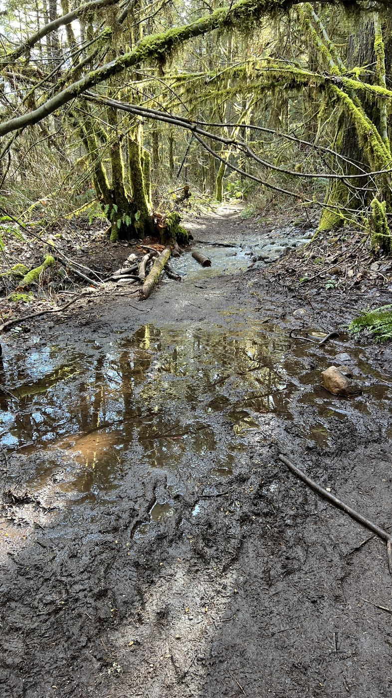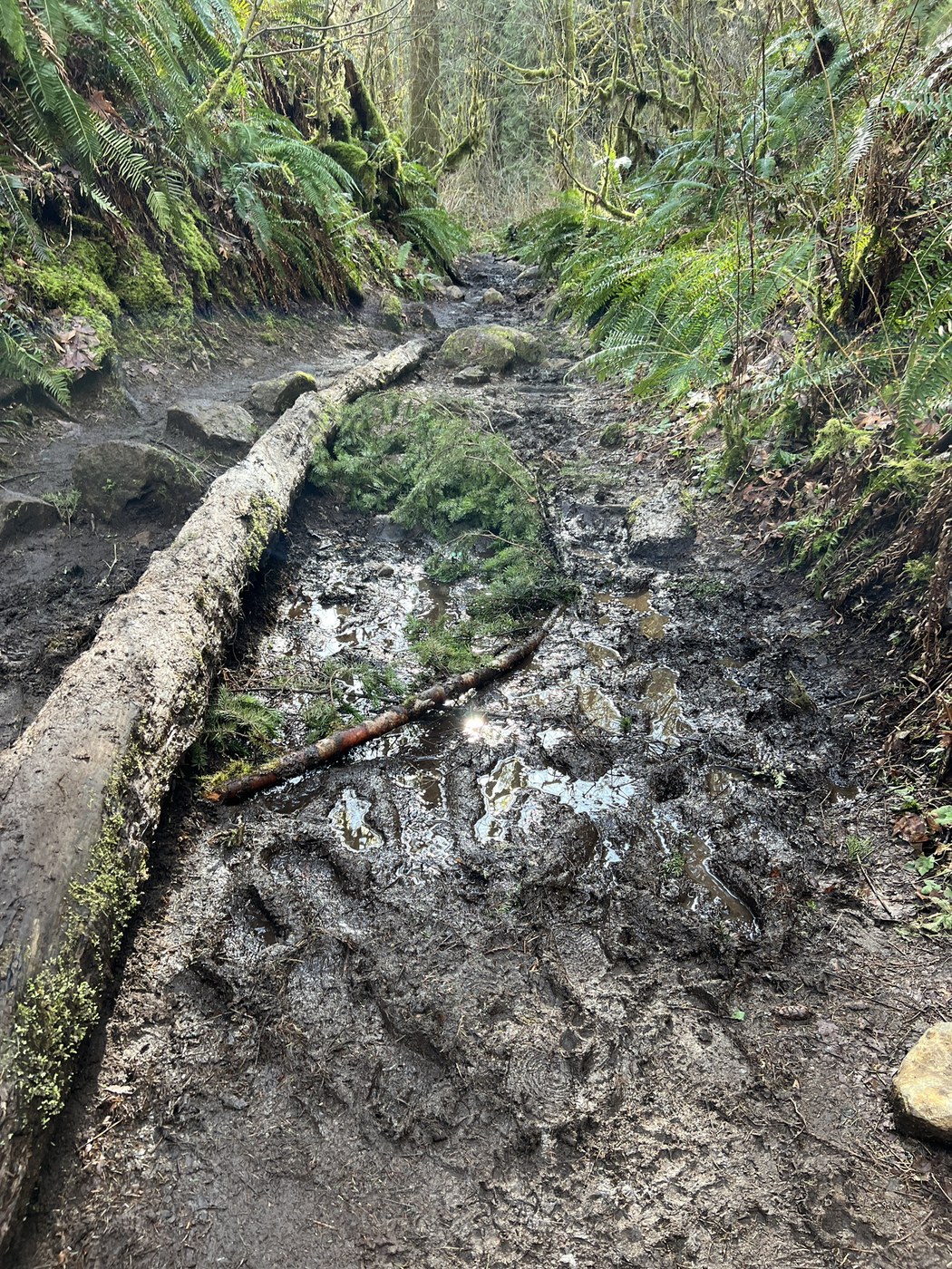 The trail is very muddy in many places especially starting about mile 1.5 and there’s often no other way but through.