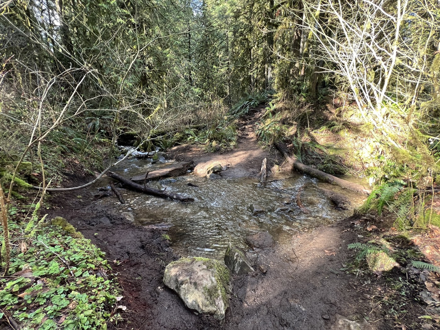 The normal creek crossings are a little trickier with all the recent rain. The big log used for the last crossing is very slippery.