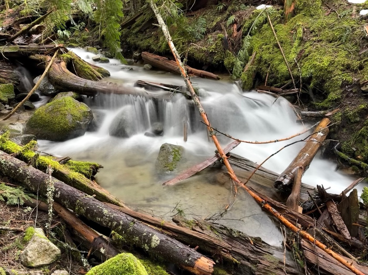 I enjoyed hiking the road though as it gave me the opportunity to see small waterfalls and views that I’d normally just drive past. Roughly a half mile from the lake there’s a cluster of a couple large trees that’s making hikers cut through the snow covered switchback to get past. Talapus Creek was running strong and looked pretty in the snow. And at the lake, which is starting to thaw, the sun poked out for an unexpected visit.