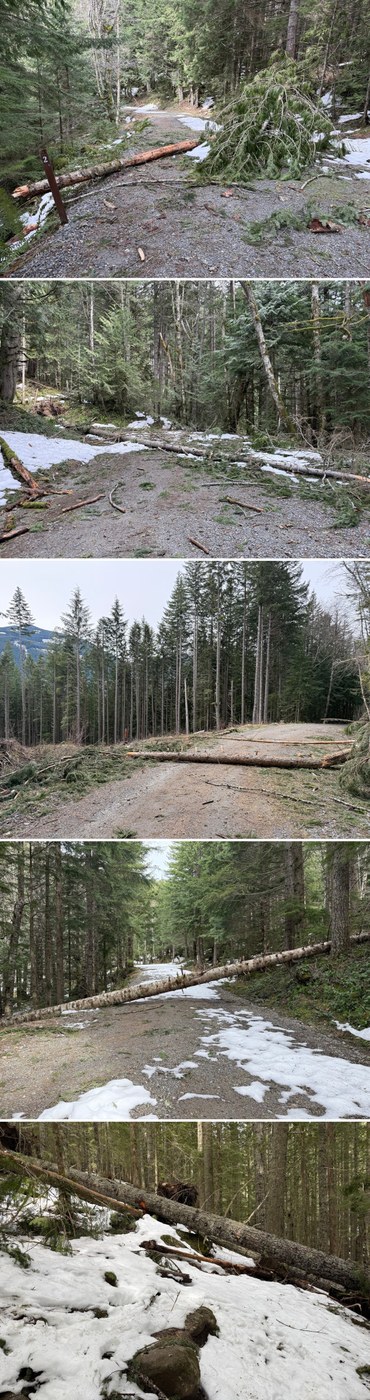 Parking outside the road closed barricade was pretty easy. Because my car was small enough to do so, I backed in to the roadside to leave more space. One other vehicle was present when I arrived and one other different vehicle present when I left, but I had the entire hike and lake to myself which I’ve not experienced here before. Don’t recommend trying to drive around the barricade as you won’t get very far unless you’re planning on chainsawing and cleaning up all the tree debris, maybe also helping to redirect the water streaming over the road that’s creating channels or rills(?) that are getting deeper. Seeing all of this made me wonder if the forest service has to deal with these issues every year before reopening the road.