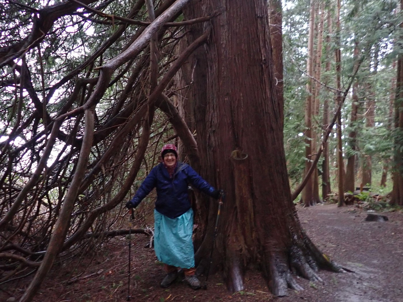 There were no recent trip entries for this nice little walk so I will try to get some general info out on this. The Interpretive Center is just a short distance from Bayview State Park and Padilla Bay. The Center itself is open Wednesday -Saturday, so not open today. I've been inside before, great place for kids with info on the intertidal life and a hands on exbibit with sea life. We walked the trails above the center and had more fun than we were expecting. There is ongoing restoration going on with a natural woodland and wildflower meadows, we could see stakes and small trees but no wildflowers yet. There was Indian plum, red currant and OR grape in flower in the forest area. We followed all the trails we could find on the hill and then headed down toward the road for the observation viewpoint and beach access. The observation area is paved with a ramp, so ADA accessible. The stairs going to the beach are narrow spiral metal stairs, kids will love this, people with vertigo will not. Restrooms in the building may or may not be open if the center is closed, but there are 2 sanicans in the parking lot, clean and stocked today. Combine this with a trip to Padilla Bay for more mileage, which we did. Padilla Bay. We parked at the north parking lot and walked down the road to the trail start. It was very windy and blowing at us and it made it difficult to walk straight. We turned around at the 1.5 mile marker giving us 3 miles to add to our walk for a good step count. I tried out my new rain skirt, it worked great for this kind of hike but would not work so well on a narrow brushy trail, it would snag on branches.