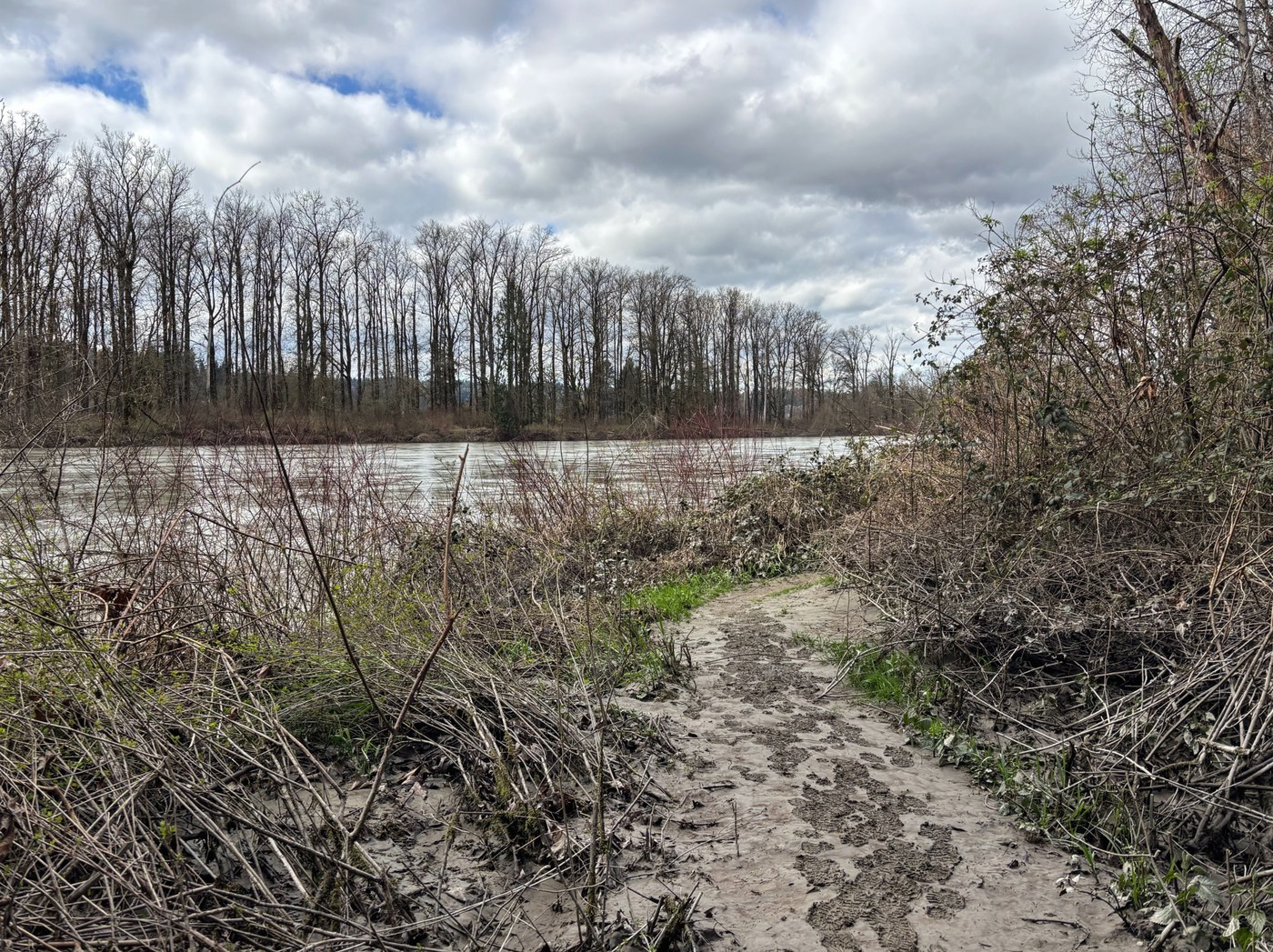 We saw tons of salmonberry flowers. There was enough mud for her to joyfully test out her new boots, but not enough for it to be a real impediment.