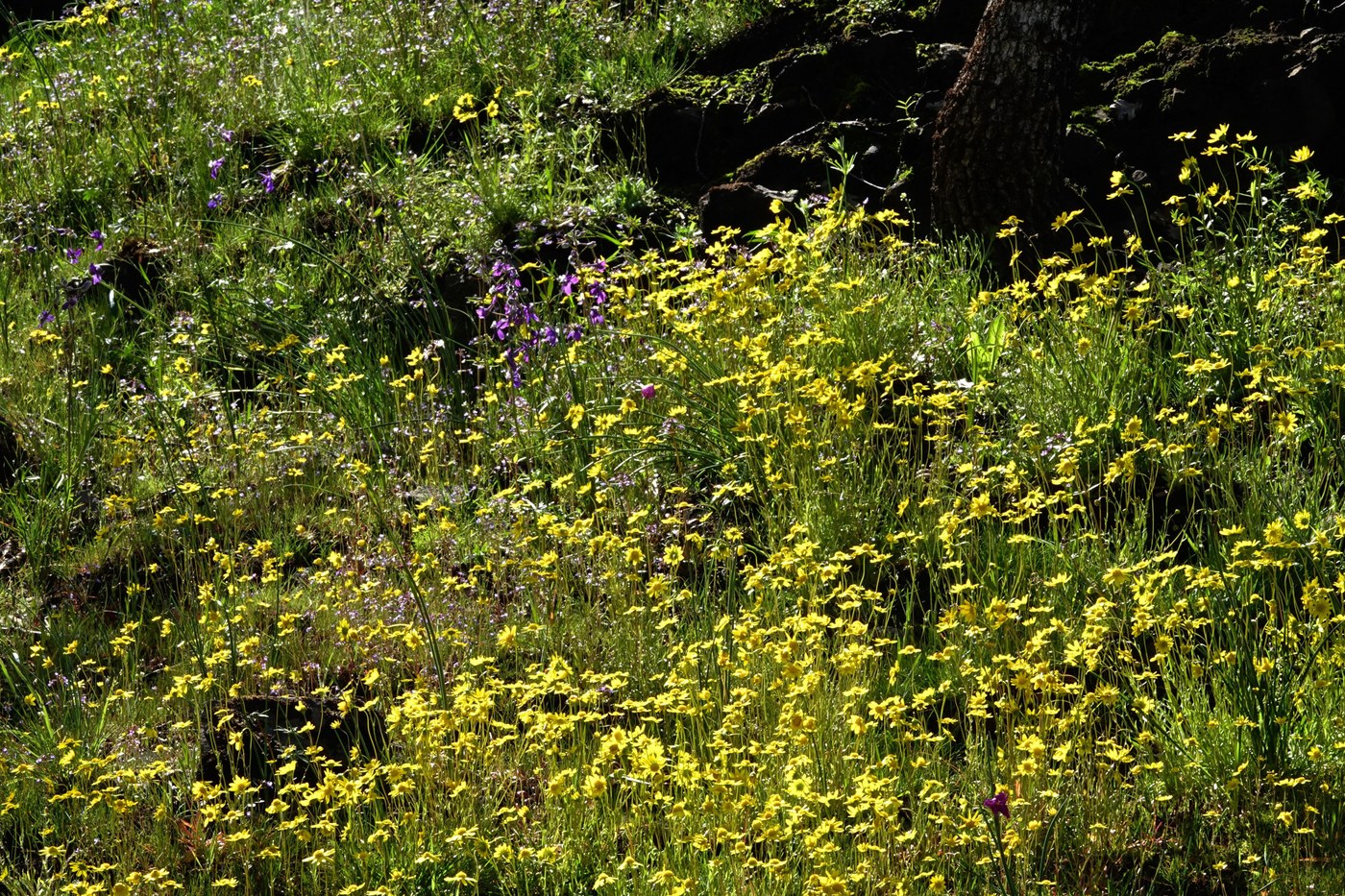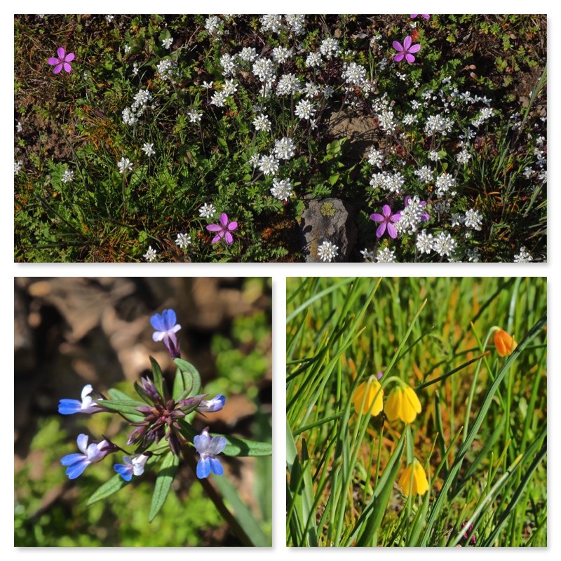Many vehicles were at the TH when we arrived at noon. We began our meander of the loop trail by going clockwise. The day was in the high 50's, but very windy! The flowers on the rocks as you drop down to the crossing of the creek are spectacular right now! Many Gold Stars, Larkspur, Miner's lettuce, prairie stars, small-flowered Blue-eyed Mary, yellow desert parsley, filaree and death camas were seen. In smaller numbers were henbit, yellow monkey flowers and 5 yellow bells just beginning to bloom! We returned to the TH from the creek crossing which was intimidating to us old folks! We probably walked only 1/4 mile, but it took us a little over an hour enjoying and picturing the many flowers!