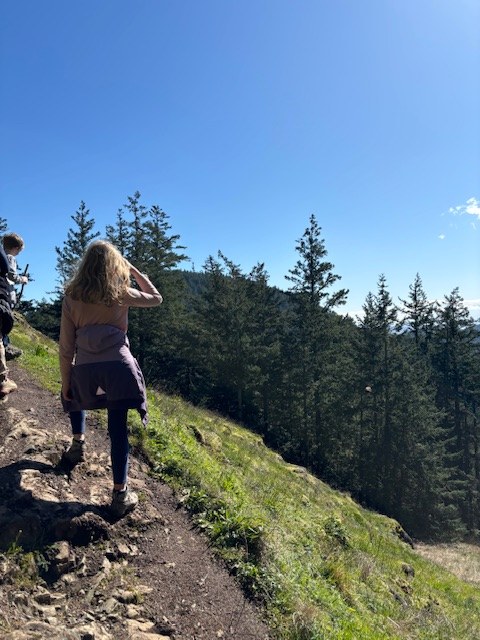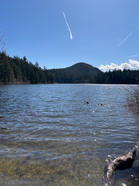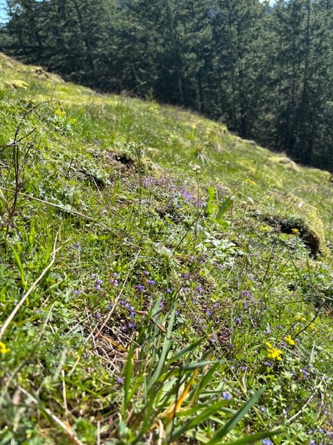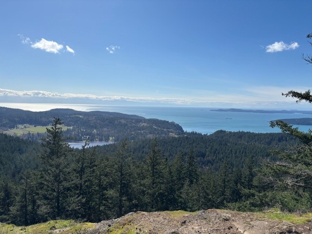 It was a beautiful spring day in Anacortes. Weather was comfortable around 50. A little bit of wind but not bad. We parked at Heart Lake and walked around the lake. One tree down that is easy to step over. Multiple muddy patches with sinking mud. A few areas where water is flowing down the trail. Indian Plum and Skunk cabbage blooming around the lake. We cross the road towards the Sugarloaf/Mt Erie parking lot but took the first left to head back towards Heart Lake. This area has the most mud and water on trail. We finished earlier than we originally planned so we drove across the street and parked halfway up Mt Erie to take the southern trail up Sugarloaf. Sweeping views. Wildflowers just starting in the meadows but we saw 6 types of flowers. Another few weeks and the meadows will be blooming. We saw the leaves of multiple flowers coming up. While coming up through the meadow a hawk circled around twice. He was eye level with us as we were going up, so we got to see him very well. Spent about 10 minutes at the top before heading back down the way we came. This approach is shorter than the main approach to Sugarloaf but still steep and rocky.