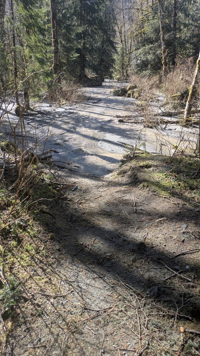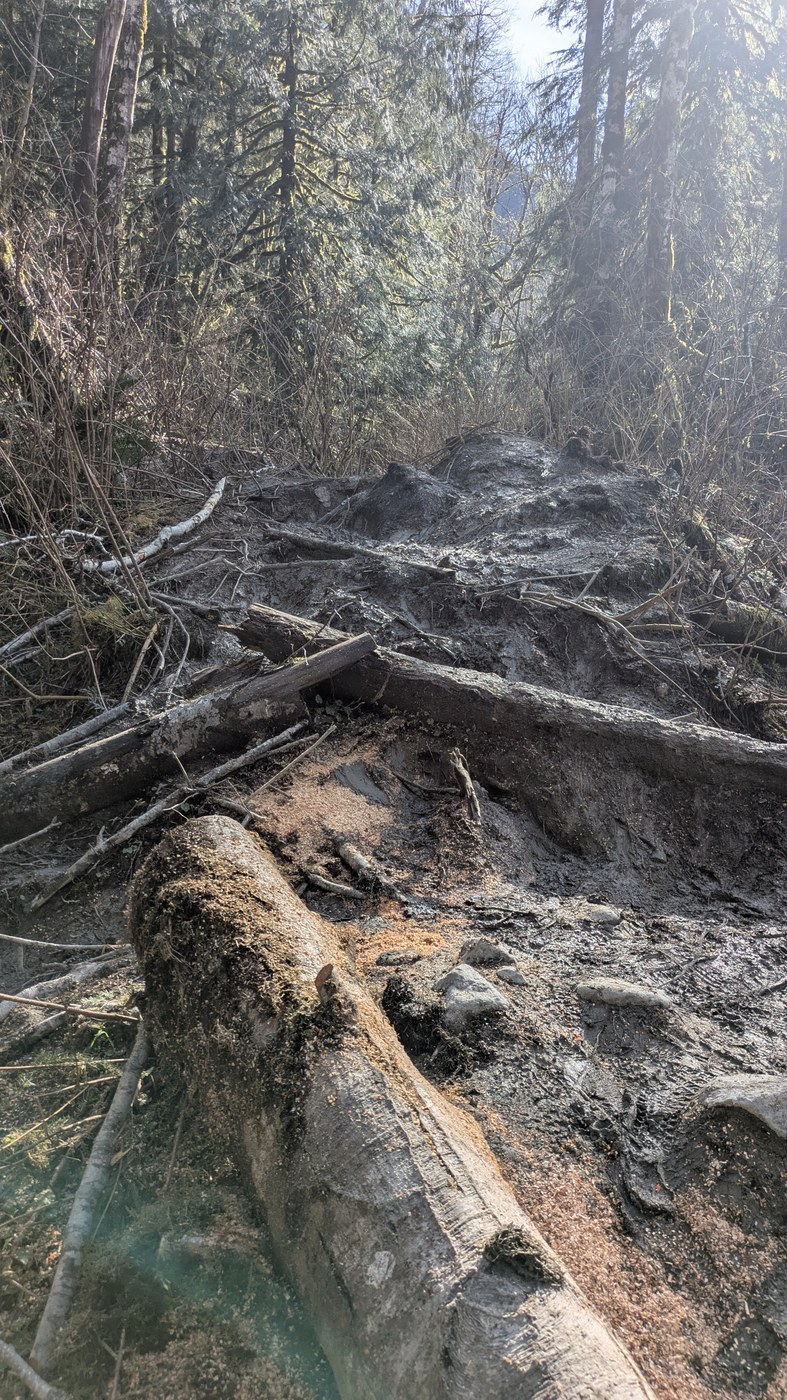 A small portion of the trail appears to have been obliterated by a mudslide about half way to the falls. It's the worst of both sticky and slippery, so be mindful of footing as you work through to the established path. Picture Below.