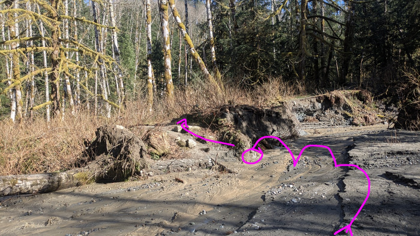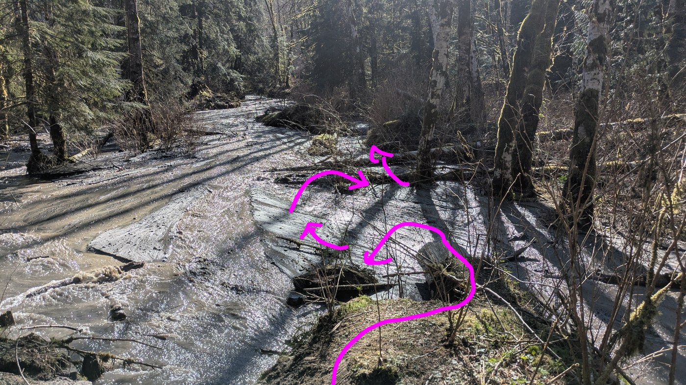 There are two major washouts (well, one washout, twice) with water actively coursing over where the trail used to be. These are both navigable, and without moistening your socks, by sand bar hopping. Notably, for the latter crossing of the main washout, aim for the granite rock at the base of the bank. Everything else is unstable and may send you right back into the water. There appears to be a tree bridge here, but it didn't seem to connect cleanly to the trail on either end, and I didn't want to gamble with the moss on it. All that said, this washout appears to be very much ongoing, so conditions could change at any time. Be safe. Pictures below.