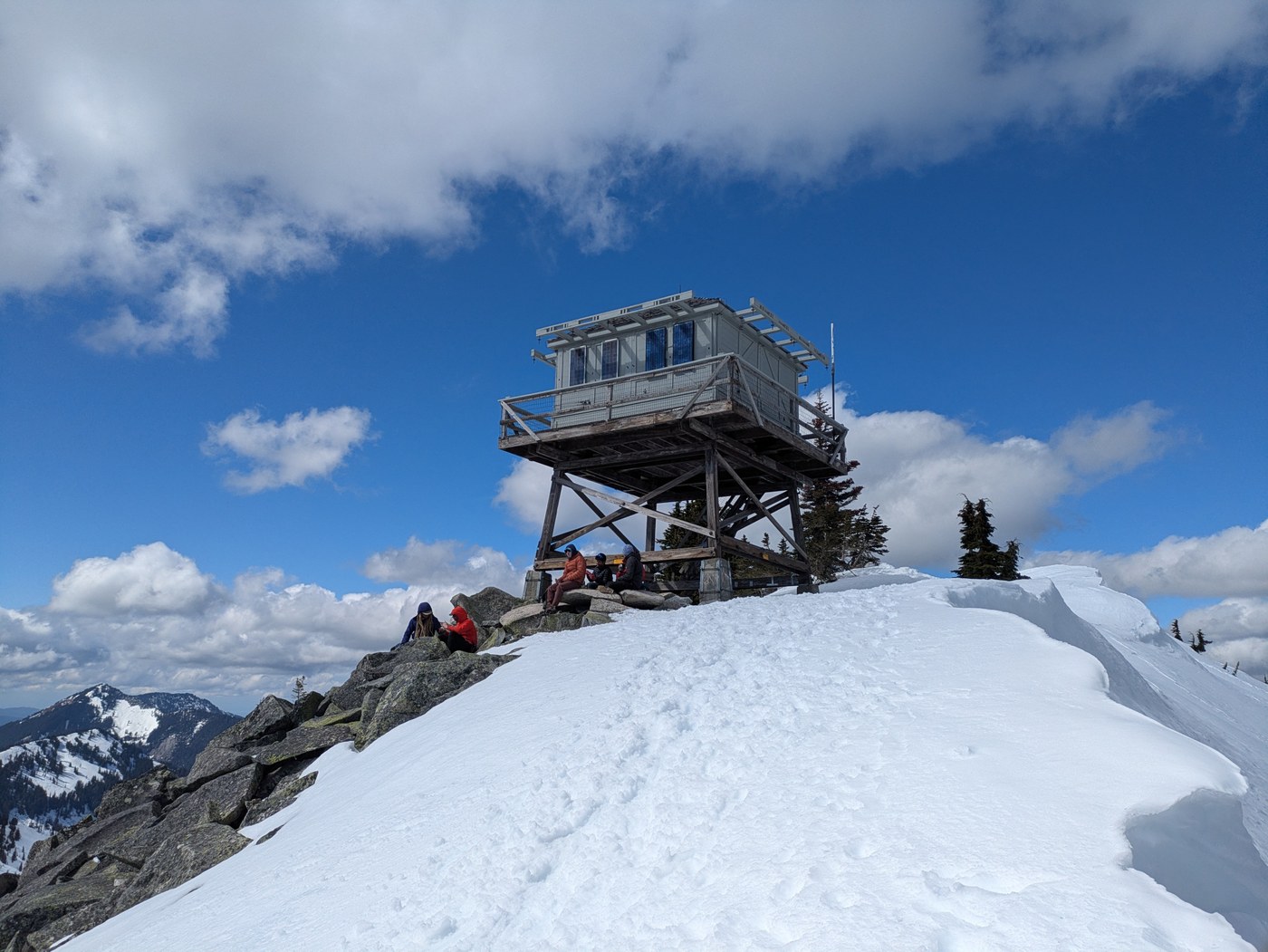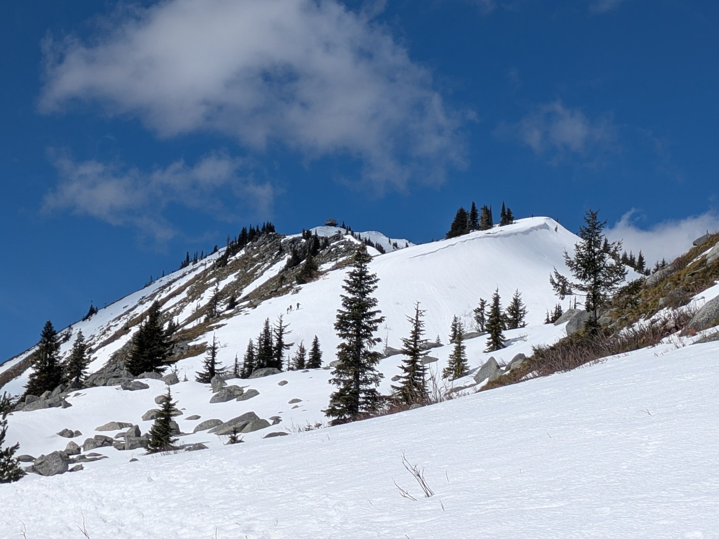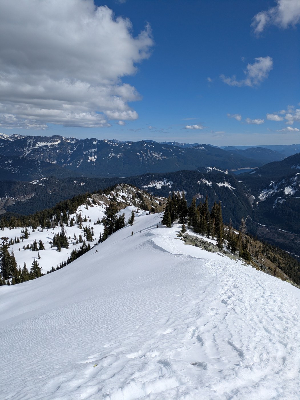 Arrived to a basically full lot an a gorgeous Saturday around 11am. A few blowdowns at the first half of the hike, but they were small and straightforward to get past. There were intermittent snow patches and they became more consistent ~2 miles in. The transition from the snow patches to the final ~750ft of gain was very post-holey. You can minimize this by following the bootpath and avoiding obvious weak spots but i still punched through to my thighs a couple of times. Microspikes made the last push to the top and the snowy descent much easier, though there were several parties who were without. (YMMV) There was no snow in the avalanche chute but there are some cornices at the top that it would be wise to keep some distance from.