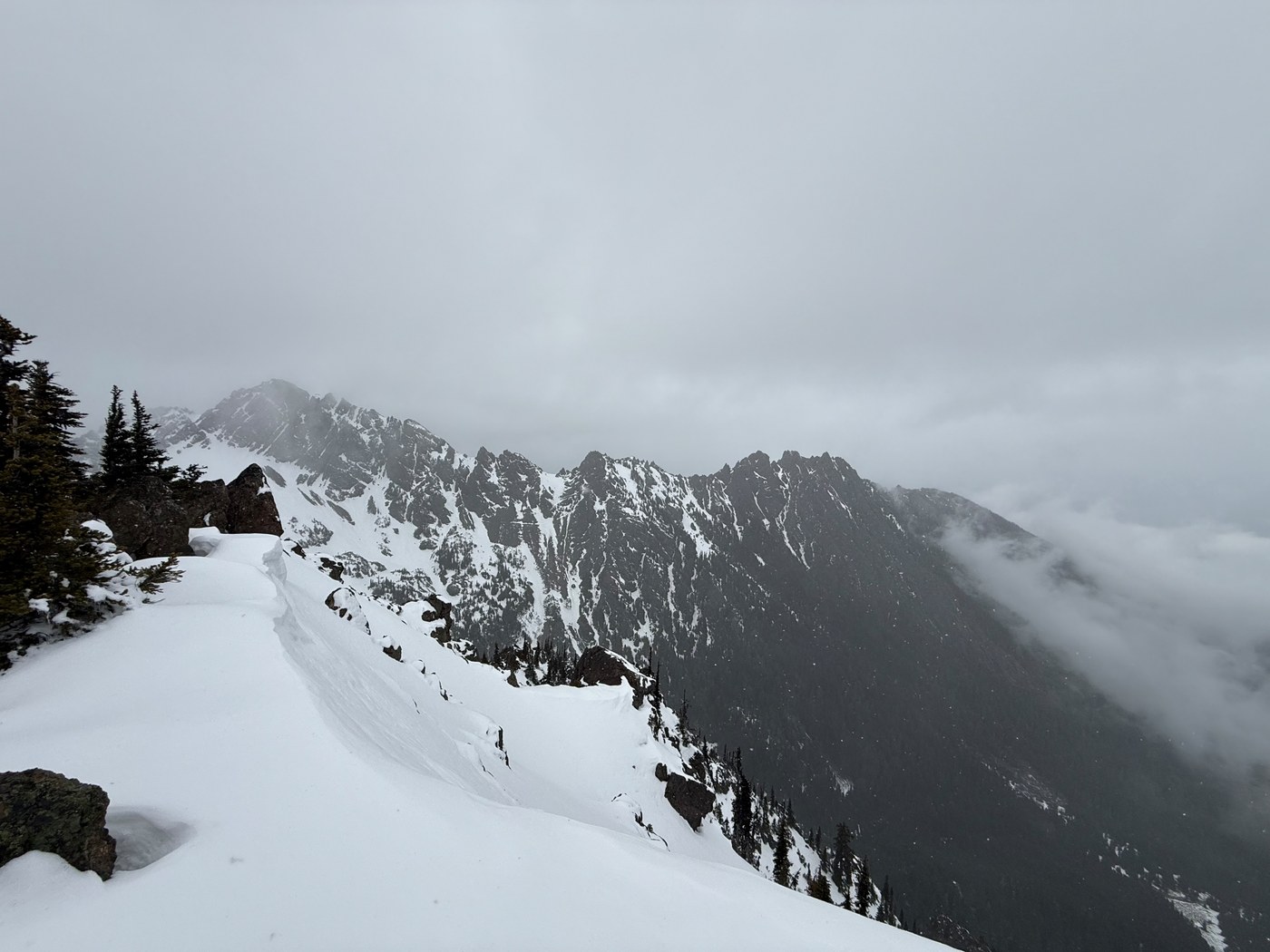 The snow cover on the trail starts quickly after the trailhead and is intermittent for much of the way, but enough of the trail is covered, and the snow is slippery enough, that I'd recommend putting on your spikes from the get-go. The two people I saw without spikes were struggling and turning around early, and one poor young man took a wipeout in front of me. That said, there's a bootpack to follow, so navigation was easy, although, as mentioned, it was snowing enough to cover somewhat my ascending footprints by the time of my descent.