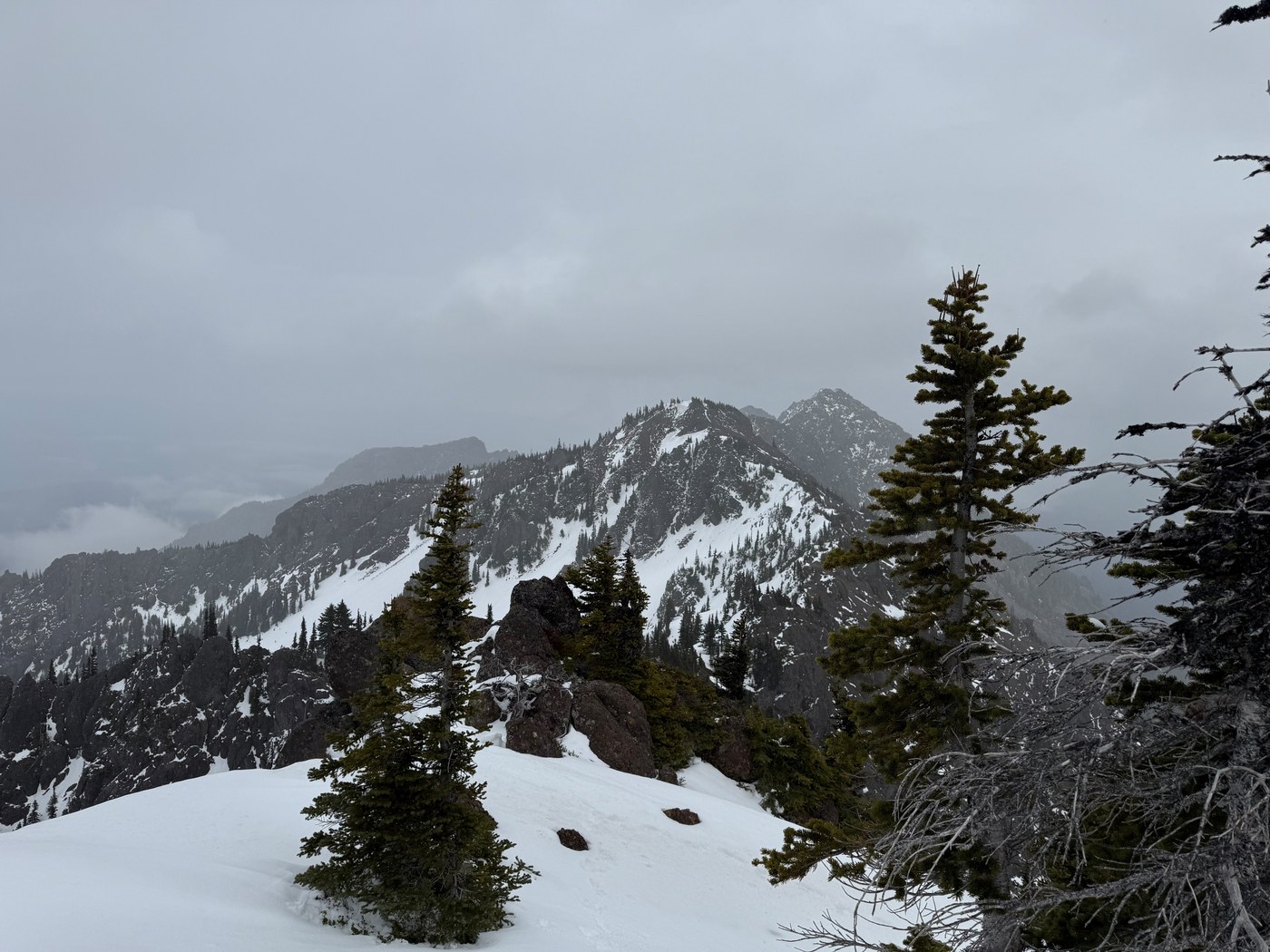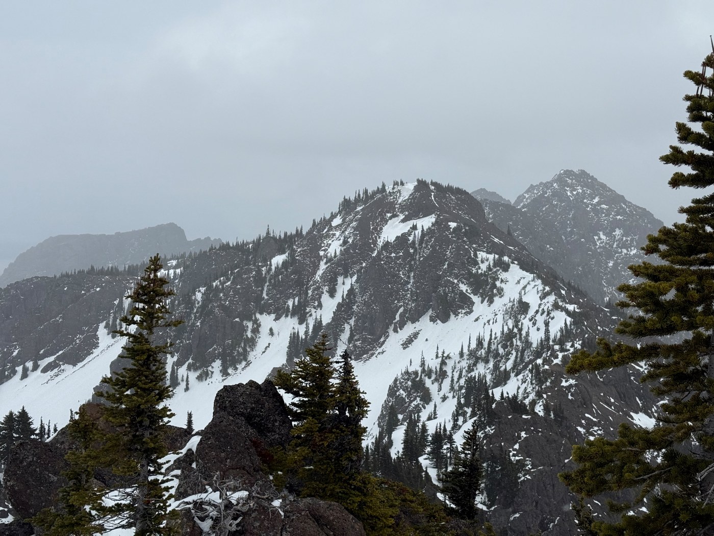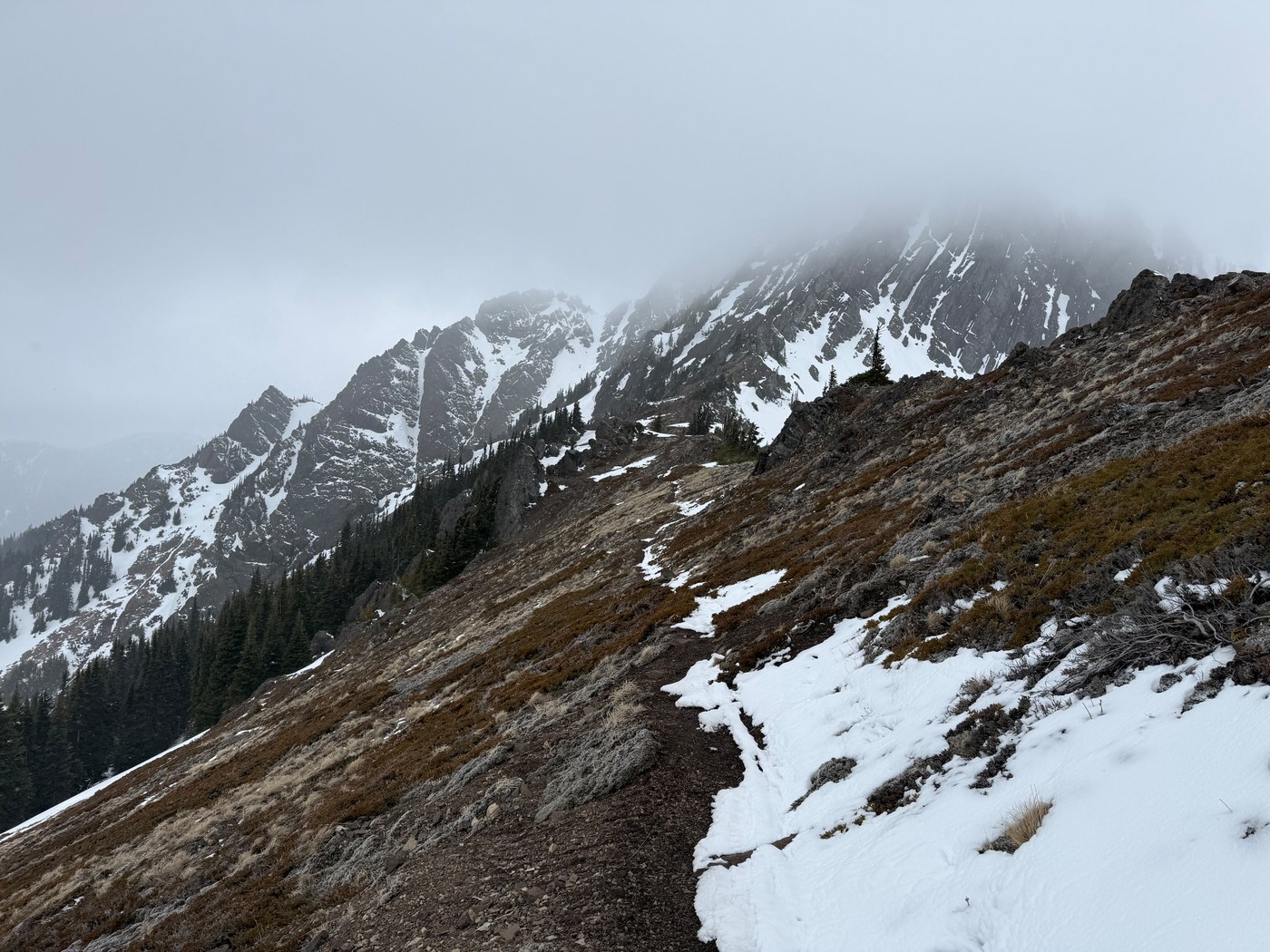 I took the Switchback Trail up to Klahhane Ridge today. I went about 2.5 miles, so not quite to the highpoint on the ridge, but to the highpoint before it, where I stopped for a snack. The weather was taking a turn for the worse, with snow starting in earnest and clouds rolling in, so I turned around there.