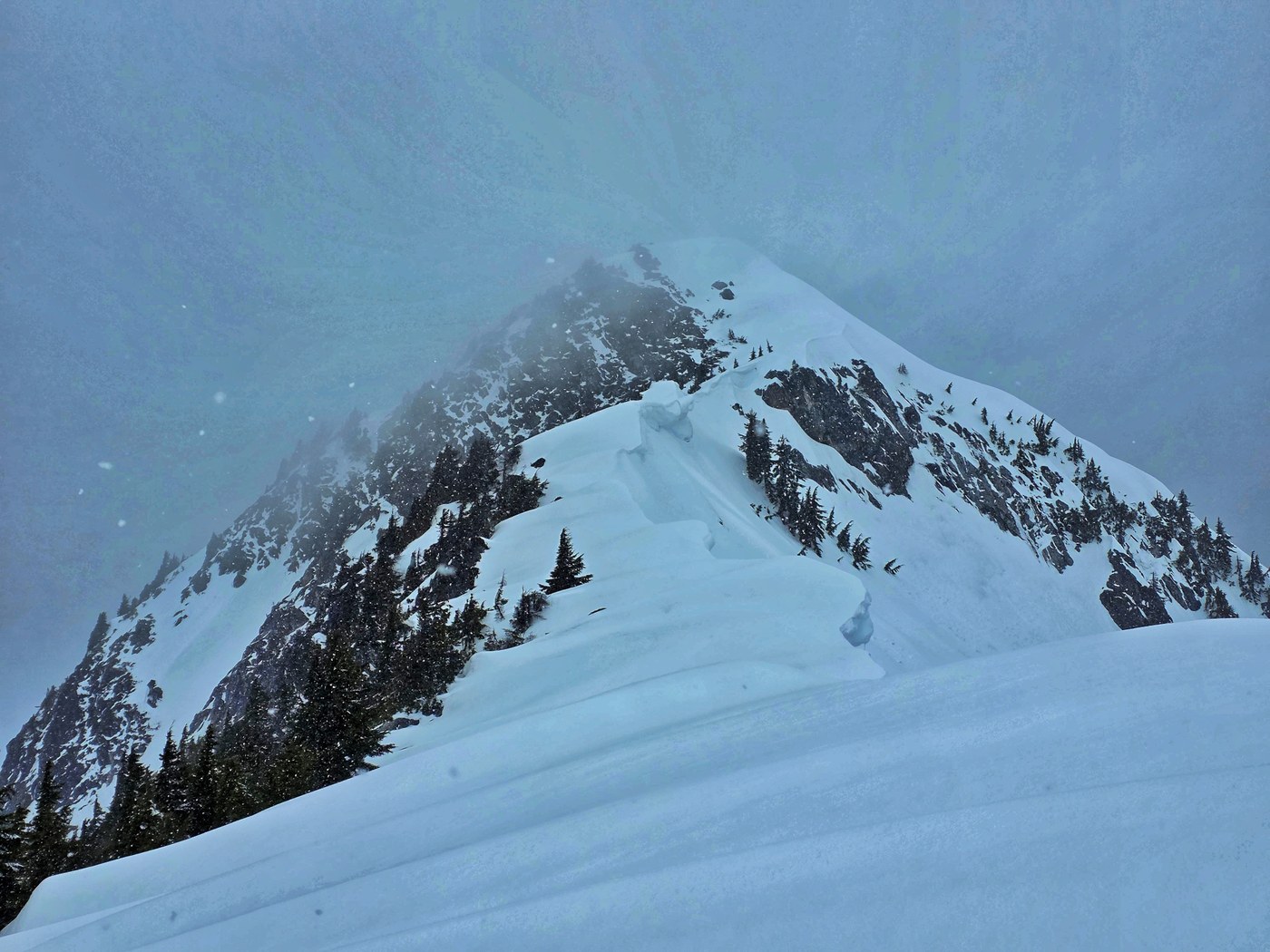 As we got back to the top of the ridge, I decided to go up further. The ridge was narrow and heavily corniced as expected. Snow was more hard packed in some sections, and crampons would have been a better option.