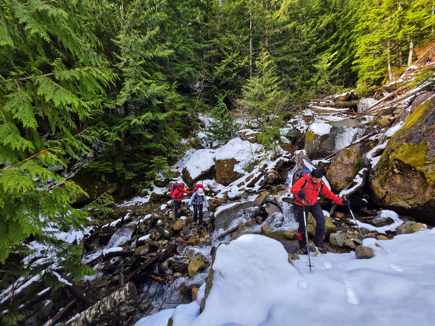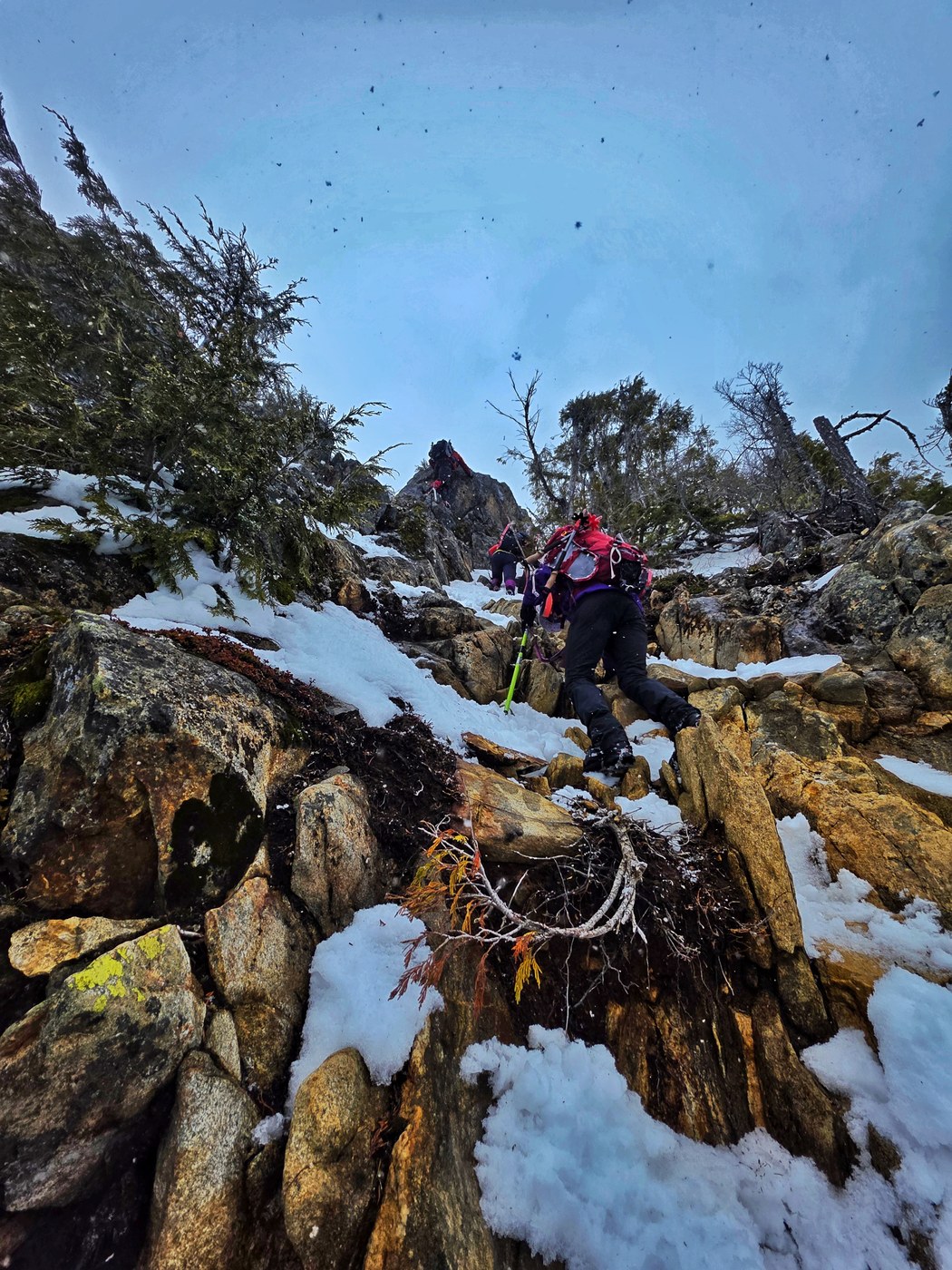 We kept walking on the logging road and missed the turnoff to the start of the switchbacks. Instead of backtracking, we decided to scramble up the slope, thinking that we could quickly rejoin the summer trail. That was a big mistake as we spent so much time navigating around a rock feature on a pretty steep terrain.