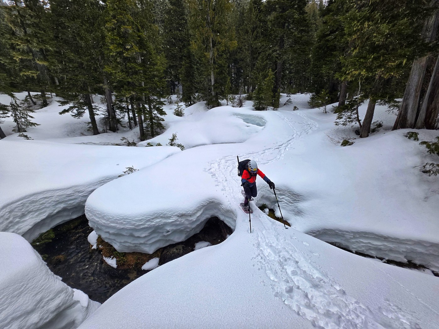 At around 4,400ft, we were above a sort of running creek with thick snow cover. Crossed multiple snow bridges that felt somewhat solid.