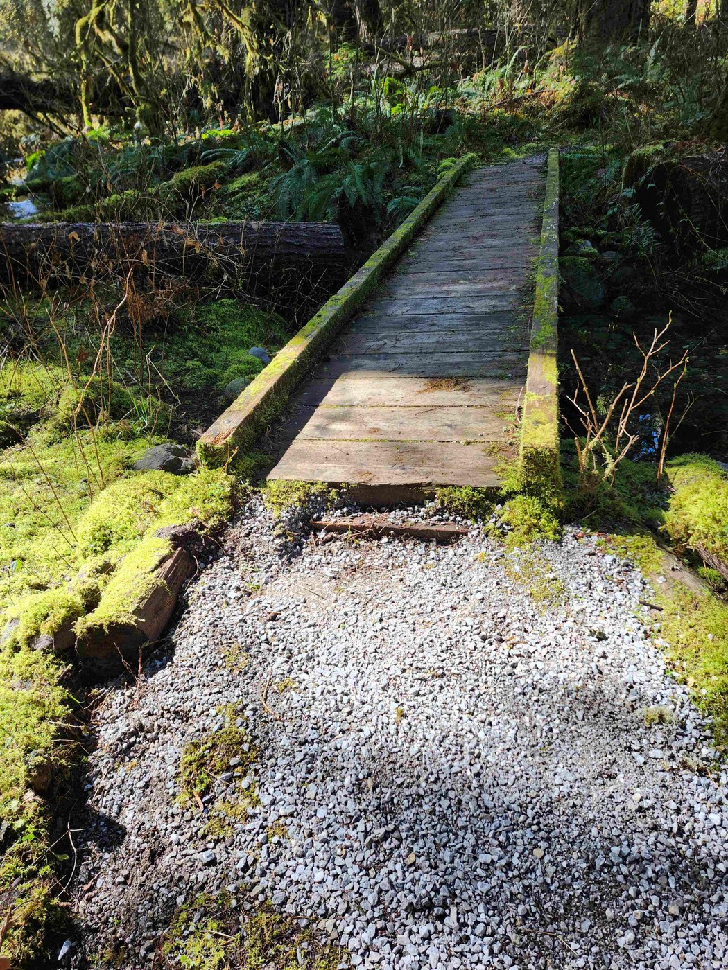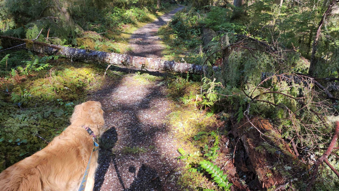 Since I had the time and the tools, the two logs are now relocated off the trail. There is one footbridge on this trail that had an approximate 4 inch step from the trail up to the bridge. So if a wheelchair is involved, you should consider whether that step is negotiable. It probably depends on the design of the wheelchair and whether one is rolling solo or with helpful people.