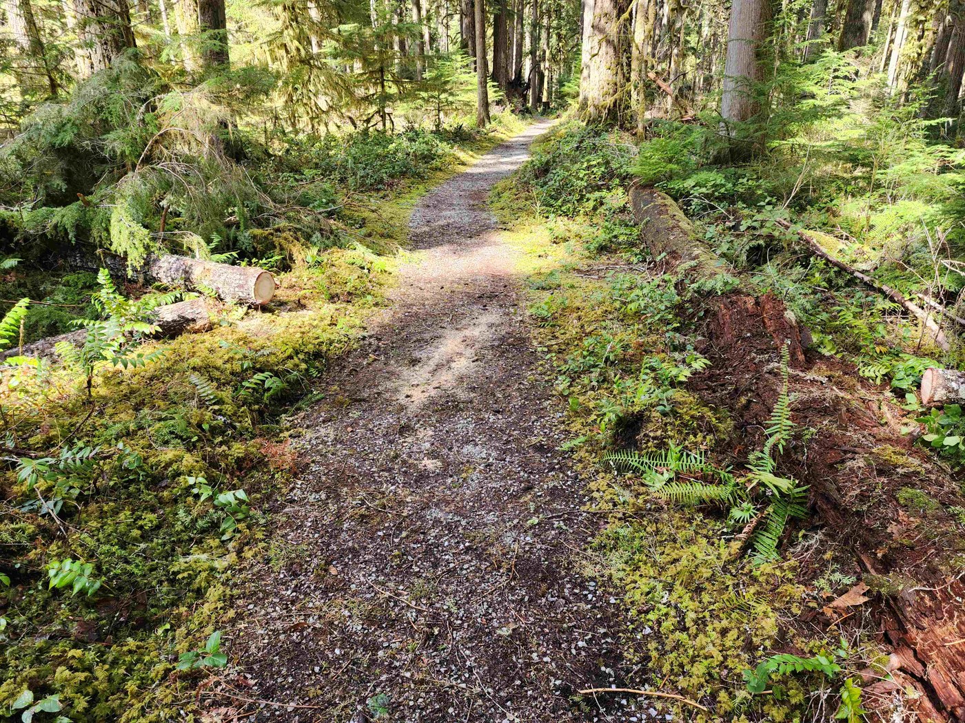 The trail starts out on an old logging railroad grade for awhile, and then veers right and heads into the forest. The loop has very gentle grades, since it is designed for wheelchairs. As I hiked the loop I encountered two locations with a single 10 inch diameter log lying across the trail. Easy for me to step over.