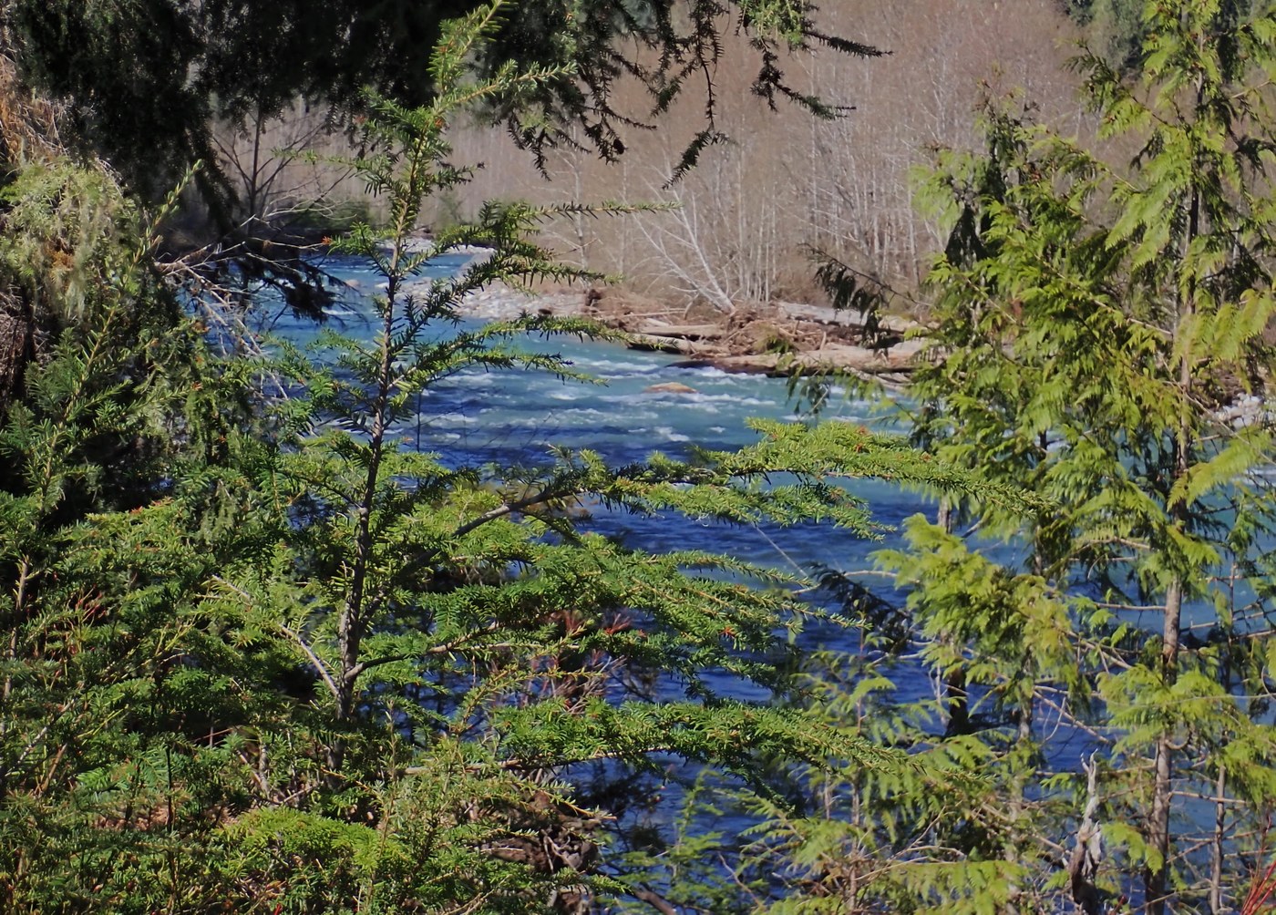 If you would like to walk at a more meditative pace, this is your trail. It's mostly flat and there is an optimal ADA loop that's wide and graveled. There are a couple of blowdowns along the main river trail, not too hard to get around, but you will have to climb over and duck under them. We only hiked about halfway so I can't report on the conditions from the west TH. Lots of flowers opening trillium, yellow wood violets, salmonberry and coltsfoot. Bleeding heart and false lily of the valley are leafed, but no flowers yet. The water was a deep turquoise and with the brush not yet leaved out, there were more views of the river and mtns beyond. The loo was clean and stocked today.