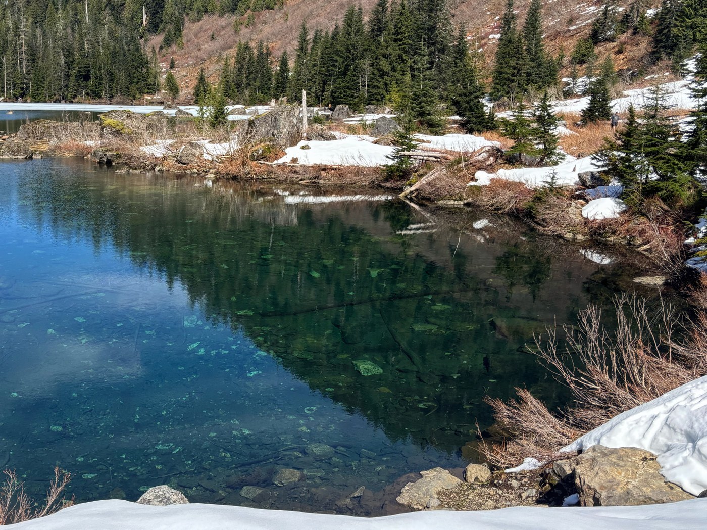 - Snow: started much farther from the lake (1,000 feet or so). However, at the lake itself, there was much less than at 22. Microspikes would be helpful on the way, but are less needed at the lake, especially on the right side. Again, the prettiest views are from the outflow, but folks were snacking on rocks all around the lake.