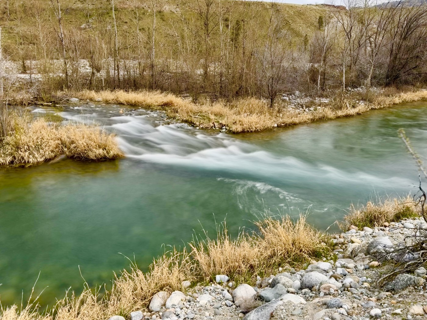 At the first junction with the Cutthroat Loop, we headed clockwise, eventually reaching a stretch alongside the river where I found a spot for Summit to get a drink. The bank turned out to be steeper than expected, and he slipped into the water while trying to reach it, scrambling a bit before I helped him back up. We moved to a safer access point, and he managed just fine the second time. After completing the loop, we retraced our steps along the Eagle Trail, pausing to take in more views of the wildflowers and the Chelan River. The river seemed lower than usual for spring, likely due to the poor winter snowpack and reduced water releases while the lake refills. Even with the overcast skies, it was a great outing and a promising start to the wildflower season.
