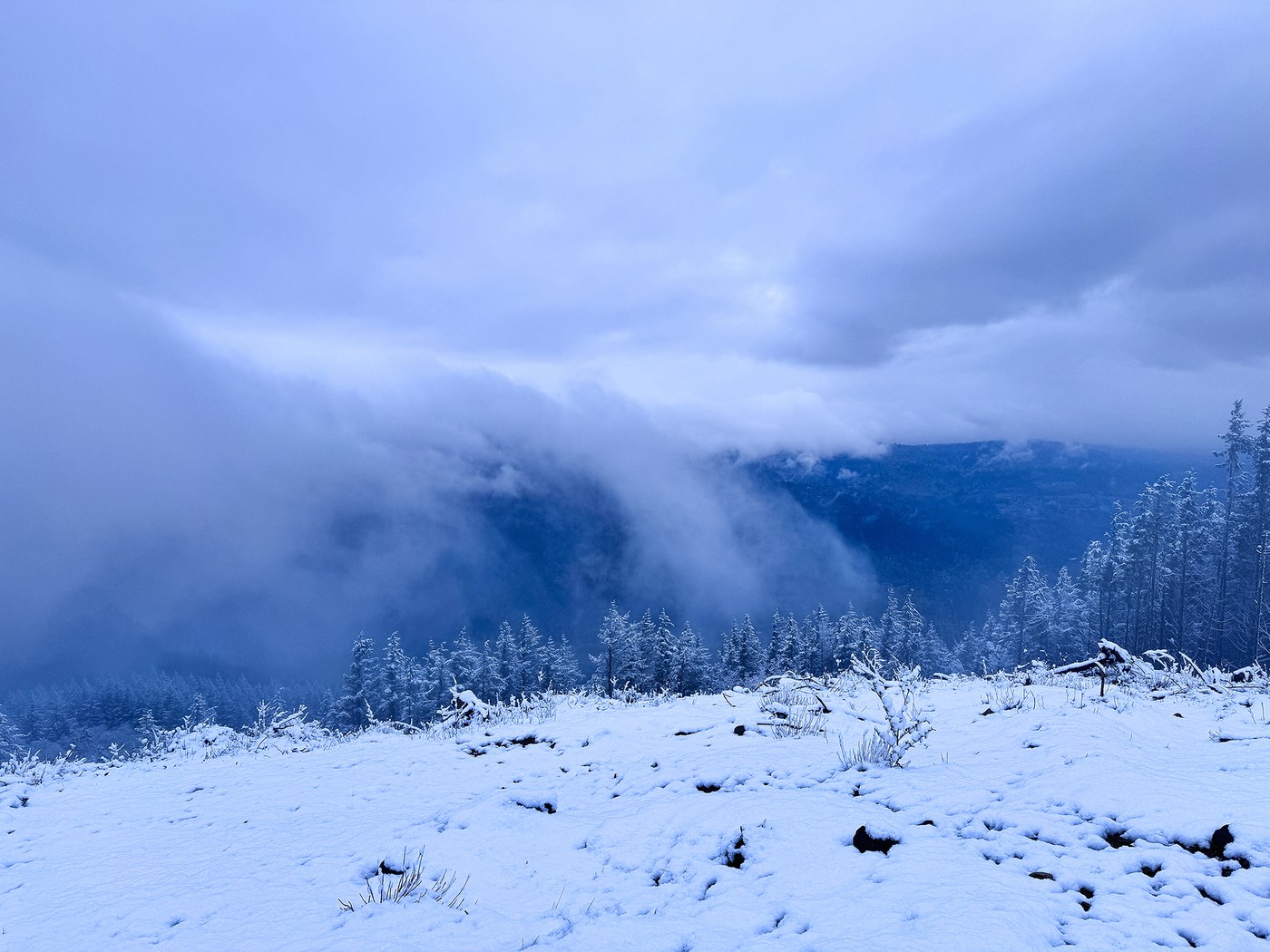 There was probably two inches of snow on the ground at the summit. The trail was mostly clear of snow. And, the trail was not icy or slippery, so we did not need micro spikes. The trail looked pretty with all the snow on the trees. A gorgeous day up there.