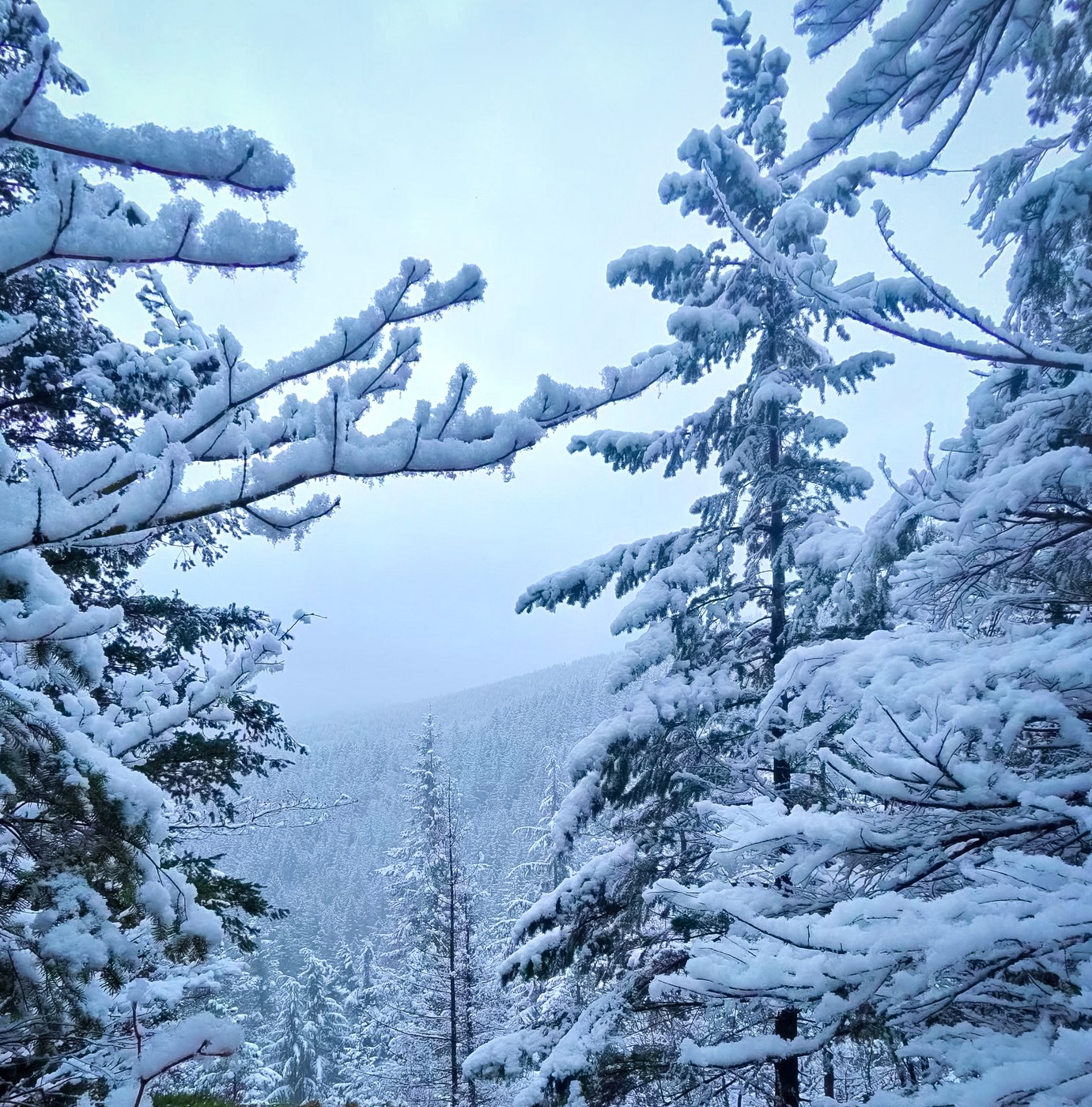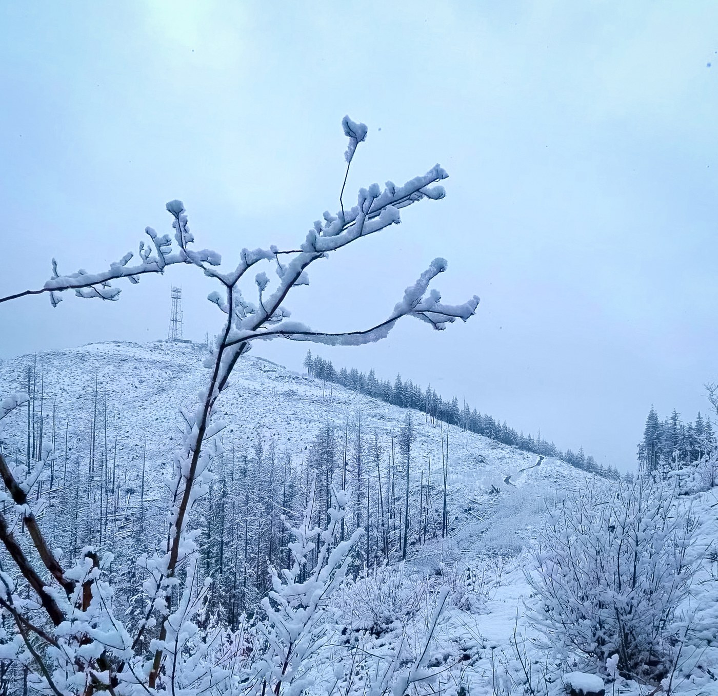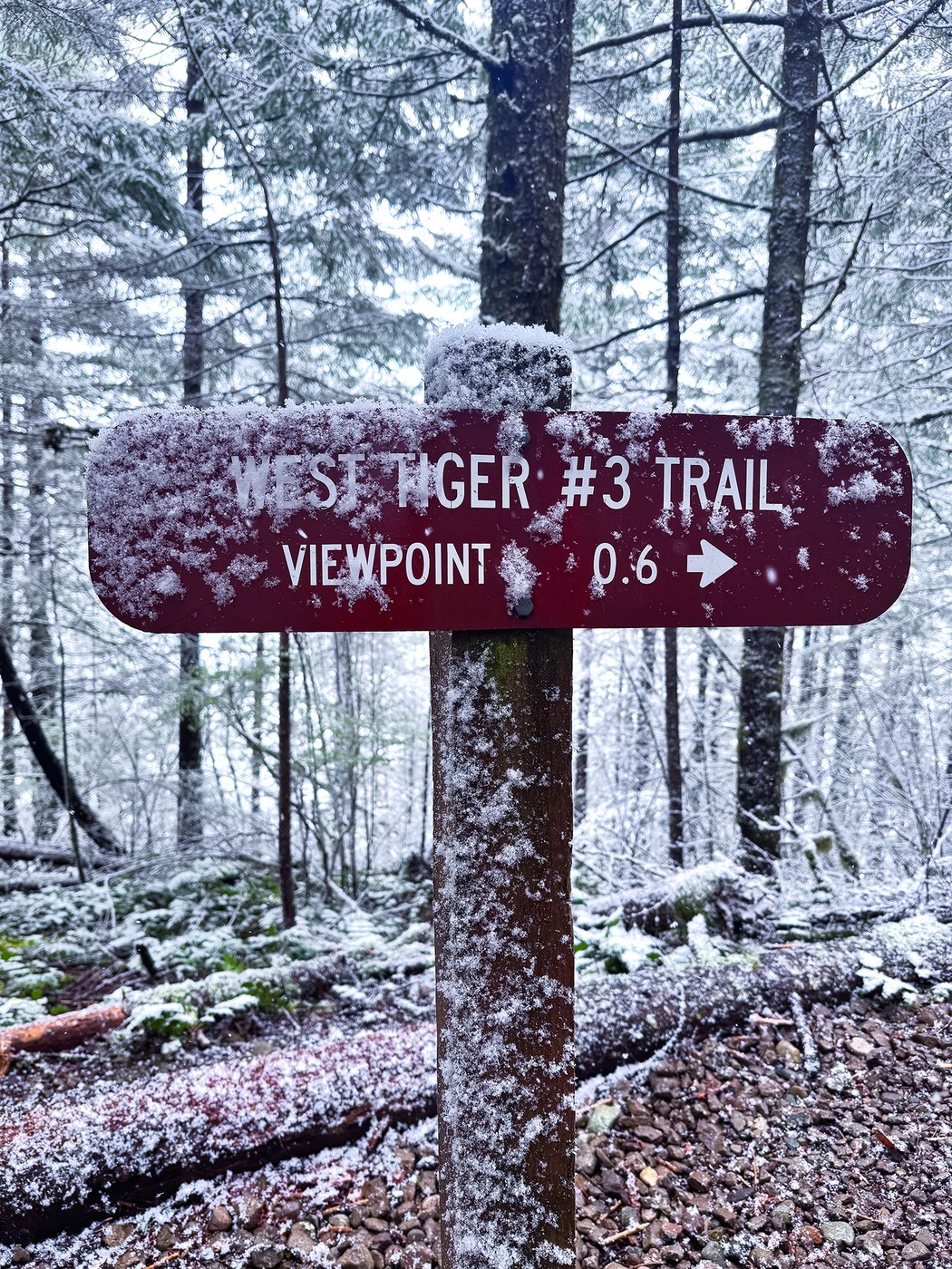 We hiked West tiger 3 today morning. It was snowing last night and the light snow fall was happening in the morning when we hiked. There was no snow in the first 1 1/2 miles. The last 1 mile had snow on the trail, and it was snowing lightly.