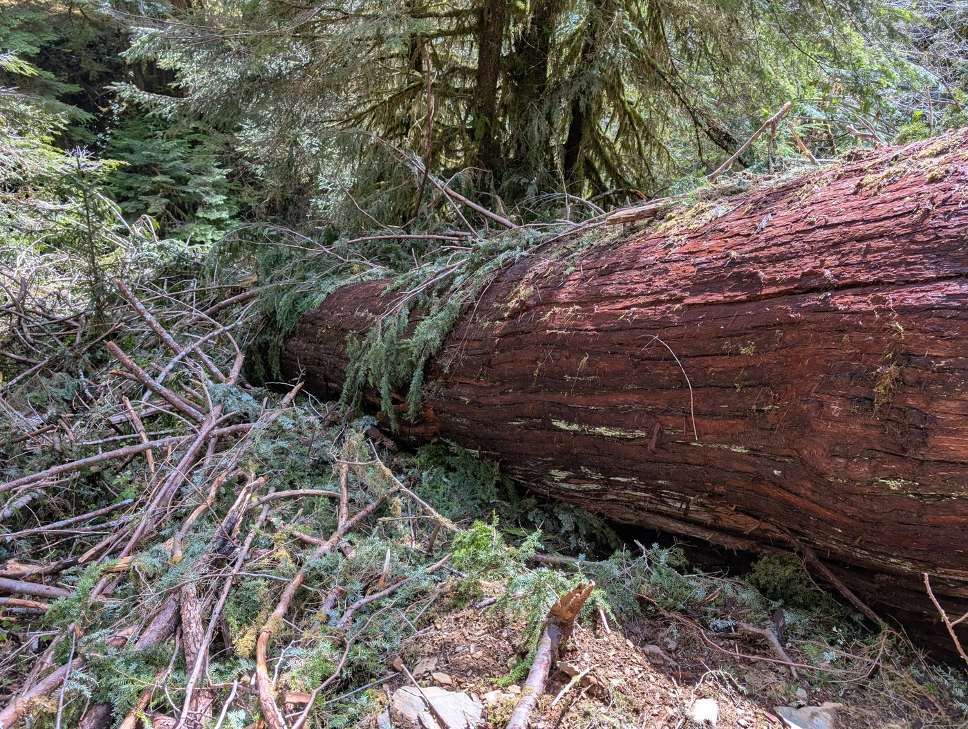 About half a mile past Pony Bridge is the most dangerous downed tree in the hike in my opinion. It is relatively easy to hop over it while heading into the valley due to a pile of sticks, but it is extremely dangerous in the opposite direction. Since it sits on a steep slope above a slot canyon, it isn't easy to get on top of it without incurring the risk of a high consequence fall. I opted to scramble up the hill using the limbs of the tree, climb on top of the rootball, and then slide down the other side. This felt super sketchy and I definitely wouldn't attempt it solo again.