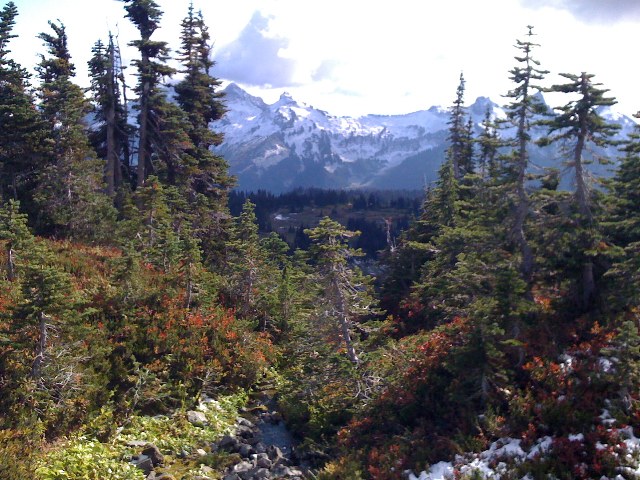 The weather was sunny and clear. The parking lot at Paradise was very crowded because it was the opening weekend of the new Vistor Center. The trail starts off paved and straight up. We saw a bear within the first 10 minutes of the hike. It was about 50 yards off the trail eating plants. The fall colors are amazing. It takes about 30 minutes to weed out the tourists from the hikers. You start running into people with 60lb packs that are headed to Camp Muir and eventually the summit. I'm not fit enough for that yet. We went from hot and sweaty to really cold. It changed very quickly. The trail became covered in snow. Not deep but annoying slippery and slow going. There is an amazing lookout area at the top of the loop before you head down the other side. You have great views of Mt. Adams and Mt. St. Helens. The backside had 2 different ways to get back to Paradise. We chose to remain on the Skyline trail, instead of taking the short cut (golden something) which would have saved us about an hour. It is really weird how many people you run into once you get within 20 minutes of Paradise. All the tourists dressed in fancy clothes and going picture crazy. The hike took us 5 hours. I've heard that people can do it in 4 hours without the snow and hanging out at the look out.