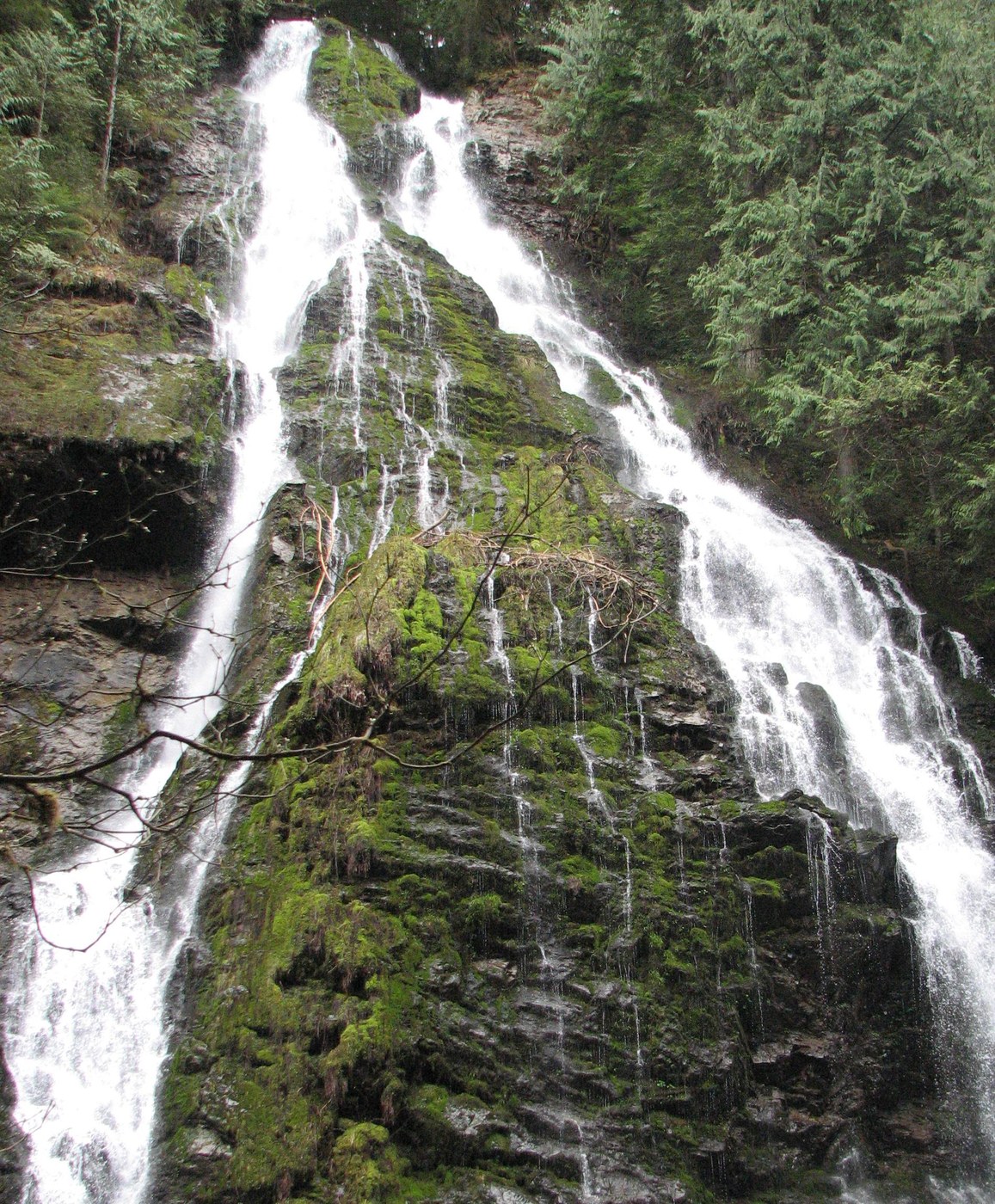It was a great mild spring day and perfect for my first mountain hike of the year. The weather was mostly cloudy with occasional sprinkles but the sun did peak out now and then. When I arrived at the trailhead it was busy with 6 other vehicles joining mine. I came across all the hikers on the trail but had no trouble finding solitude when I wanted it. Not long after starting down the trail I found the sound of the river and was soon seeing it throught the trees. The spring thaw is on and the river is running fast. The rivers green water quickly becomes white and frothy as it clears the many rapids and rocks that are found here. The trail itself was easy to pass for over two miles. All the blowdowns have been cleared out. Wet in places and slightly muddy in others I had no trouble gettting to the two waterfalls found along the trail. After the second fall the trail became messy. A few inches of snow covered the trail in places and while easy to cross it made it very wet. I also started running into mudholes. Once I saw skunk cabbage growing right along the trail I found a spot on the river to rest before turning back. I'm not sure how far up the trail I went but I know I made it past the half-way point. Be sure to wear your boots until this place dries up a bit more.