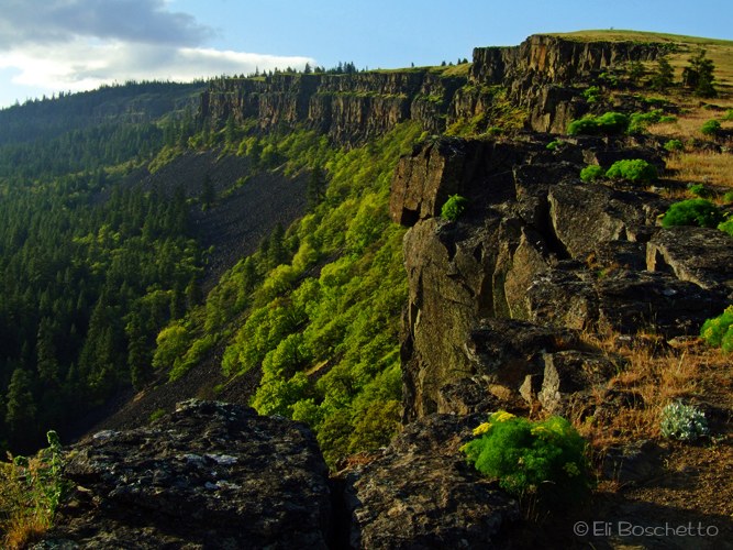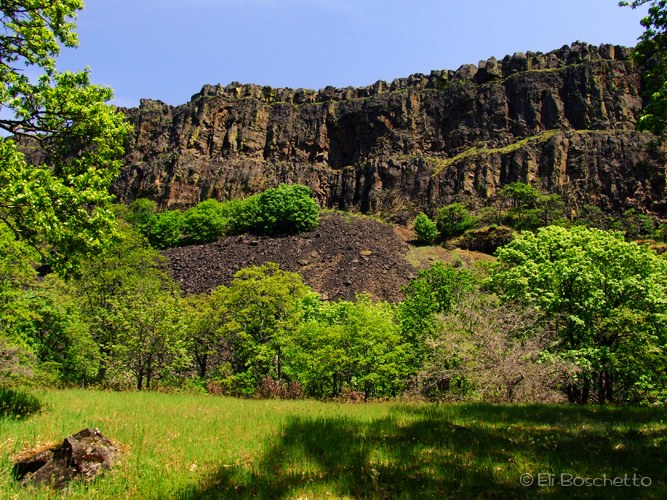 Trailhead very easy to find, right on the corner of Hwy 14 and Courtney Rd, about 3 miles east of Bingen (across from Hood River). First portion of hike along base of wall shady and cool. No trail issues. Lots of little spring color: buttercup, candyflower, cluster lily; trillium on the decline. Middle portion up Courtney and Atwood Roads clear; back on trail and in the shade, lots of blue buttons and fairyslipper.