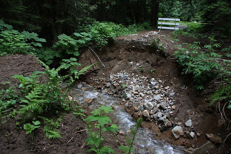 The road in is in good shape aside from some potholes and the gaping chasm near the fork for Sloan creek campground. At the turn off from the Mountain loop a sign announces a road closure from June 22 - July 3rd for repairs! Along with the repair theme a lot of recent work has been done along the trail. A large group was camped out at Sloan creek as we walked through. This was at first puzzling since no vehicle was seen anywhere. We assume it was the trail maintenance crew and their van was parked elsewhere. Lots of freshly cut logs and not a single blow down all the way to Red creek, our turn around point.