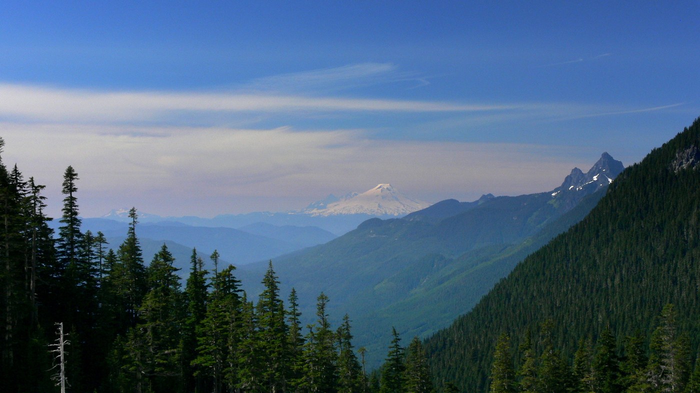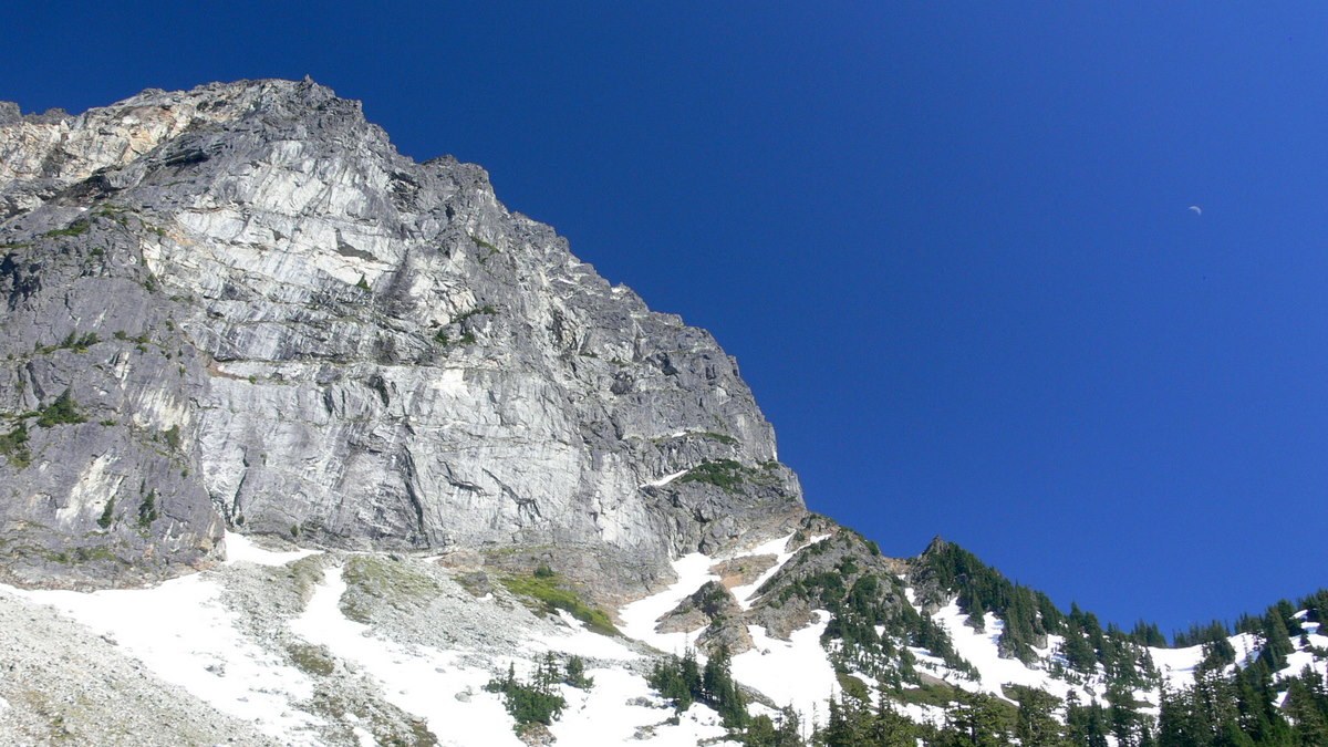 Mina was bushed, so we headed back down, and stayed more in the woods, discovering an eden-like mossy slope with a braided stream running through a 20ft.-wide swath of shaded green carpeting. We crossed a branch of Bedal Creek, then popped-out into the avalanche/landslide channel and hugged the west rim until it seemed safe to cross below the snowbridge. Found the trail at the 4x4 and enjoyed the forest, flowers and occasional views on the way down. Did I mention Mt. Baker from the upper slopes? Paused just west of Darrington on the drive back to watch the evening light rise up Whitehorse.